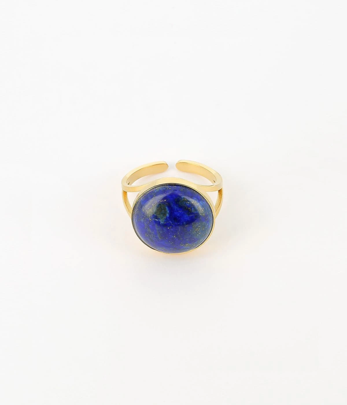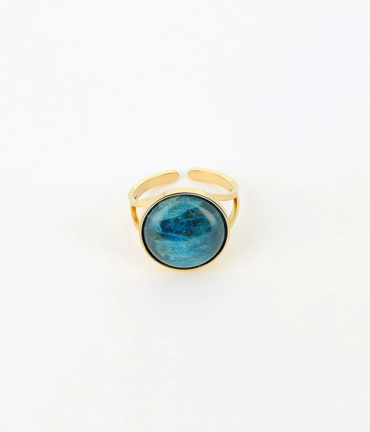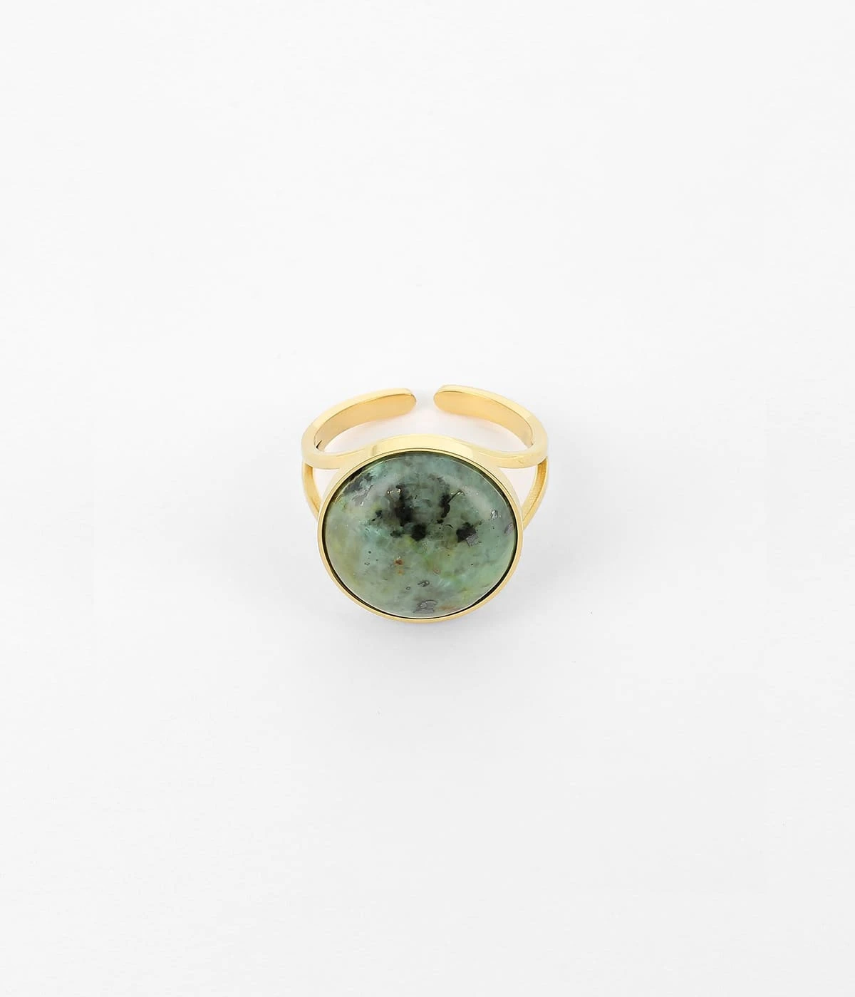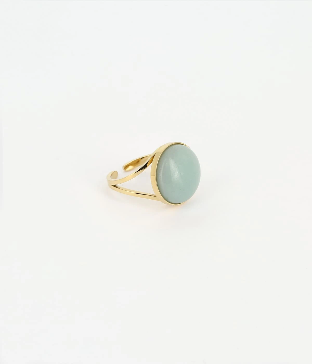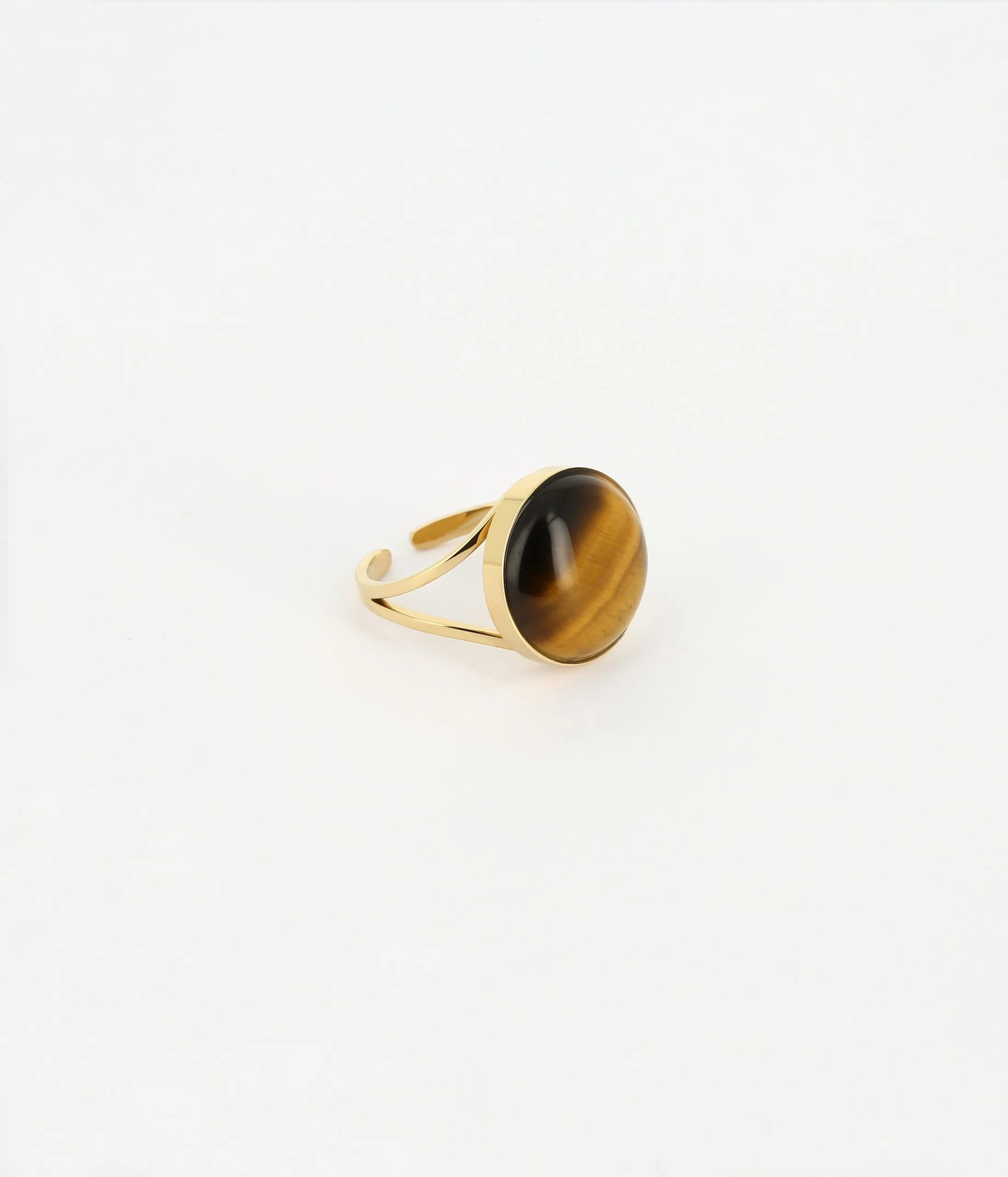 Bague en acier doré à l’or fin sertie d’un gros cabochon de pierre naturelle.