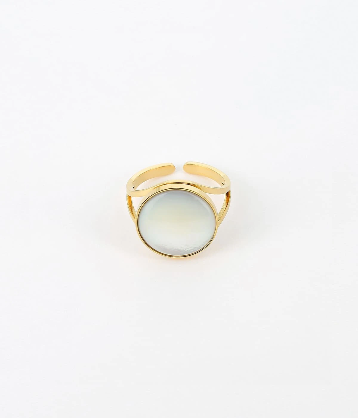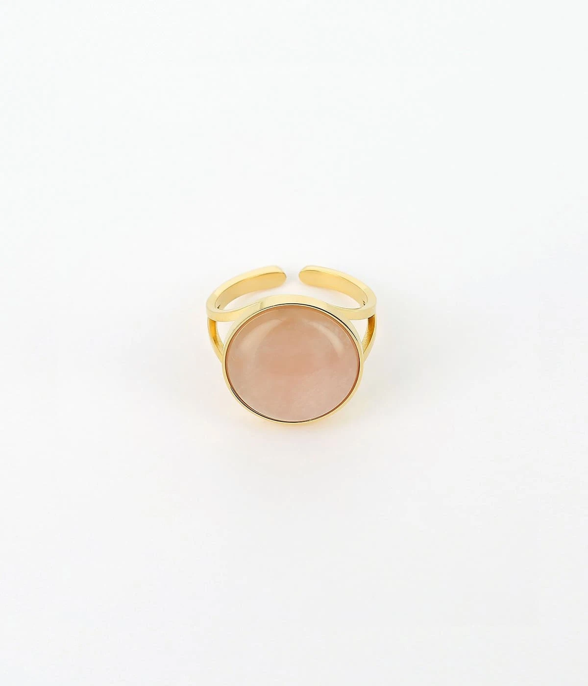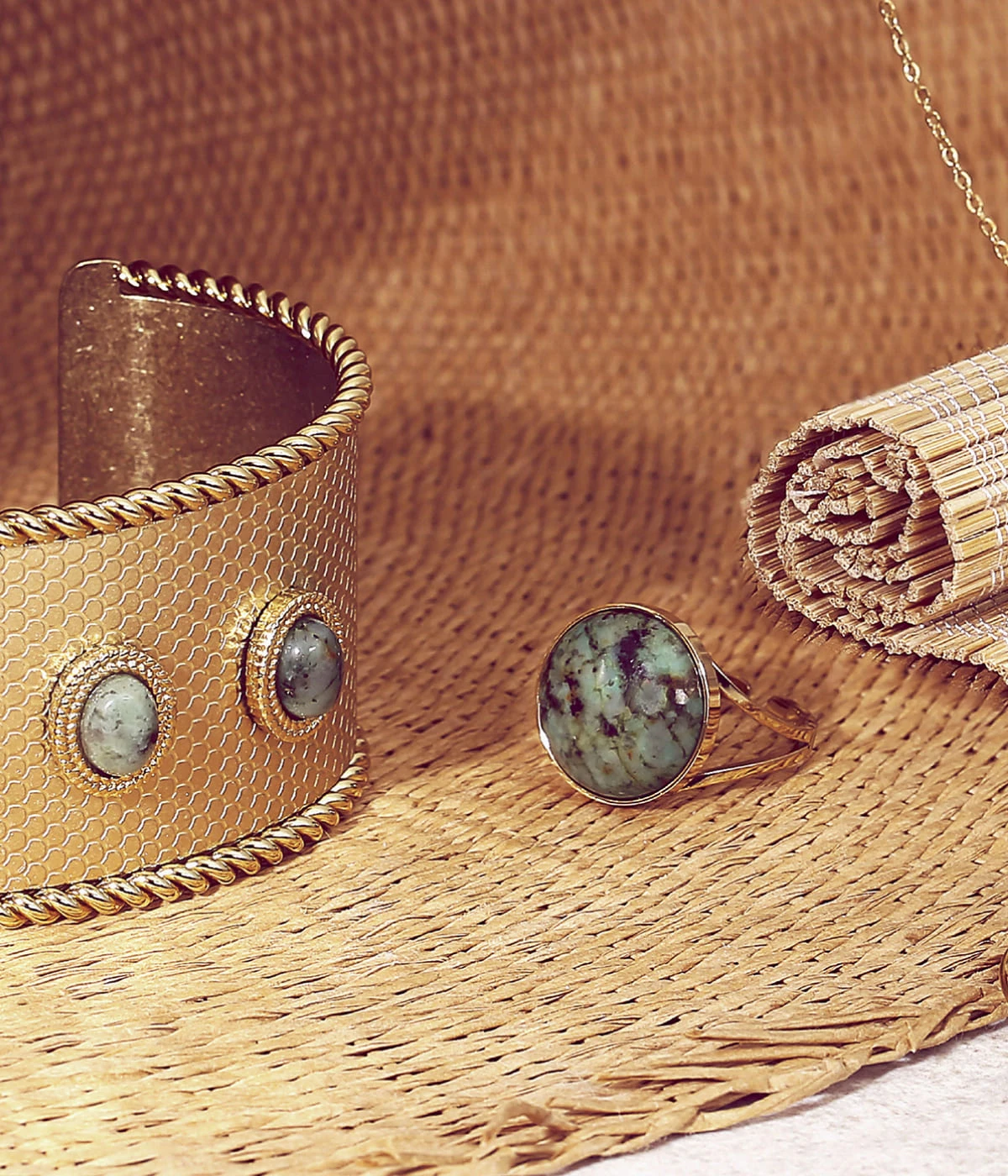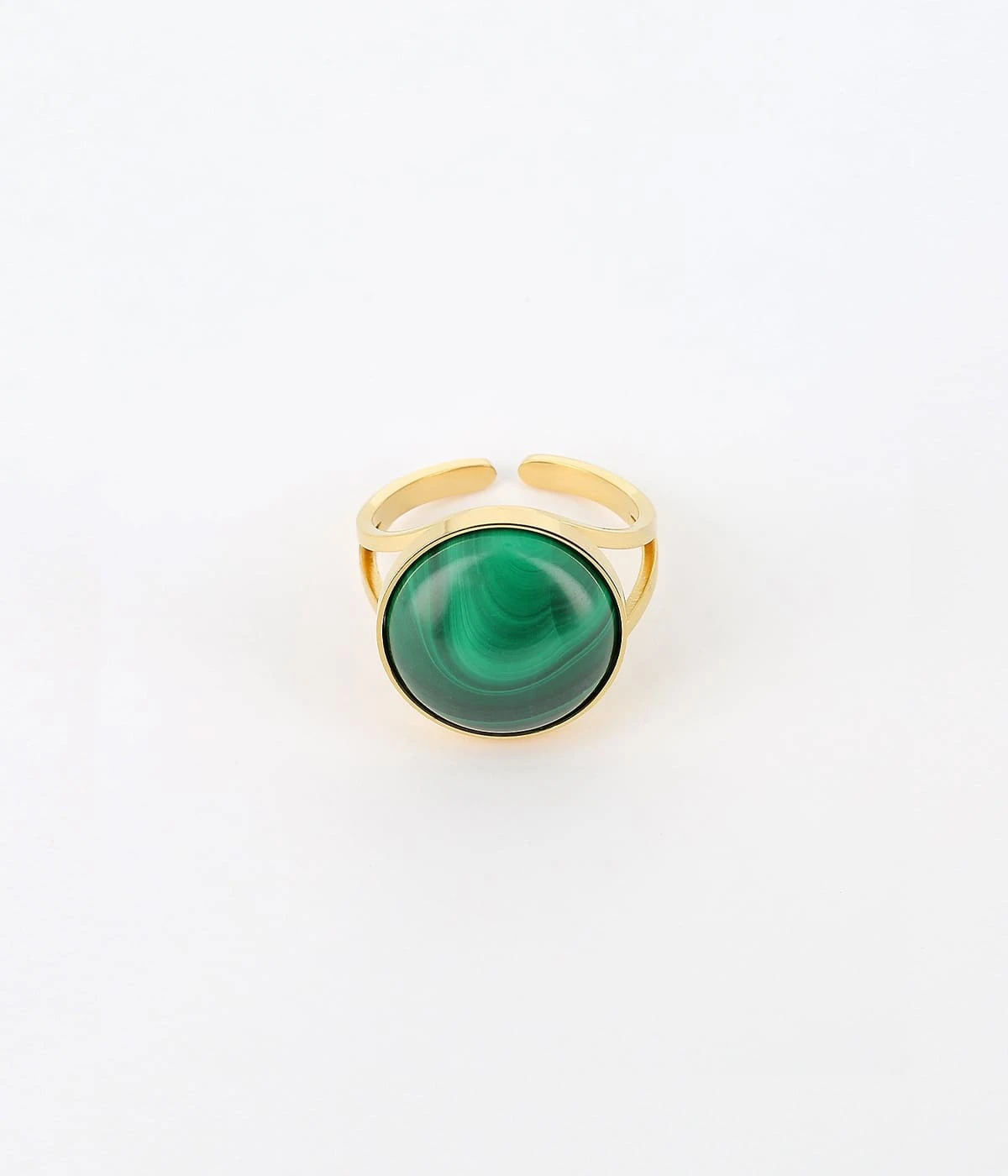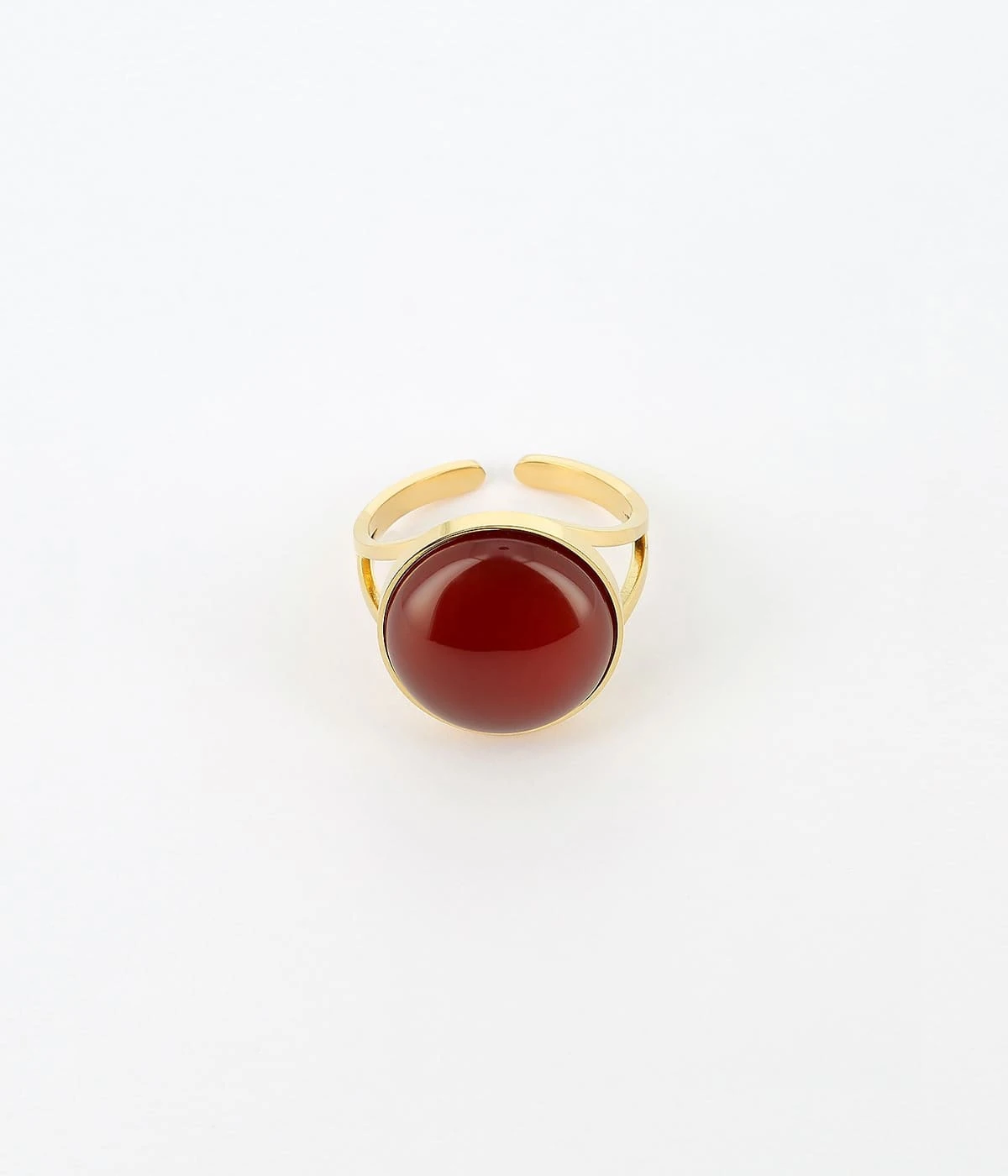 Bague en acier doré à l’or fin sertie d’un gros cabochon de pierre naturelle.
