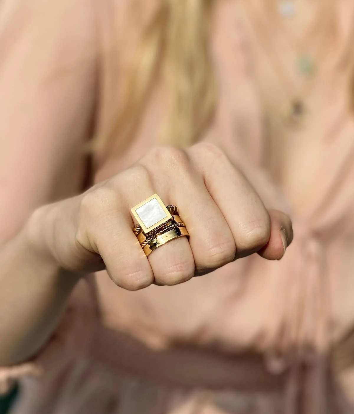 Bague large ajustable en acier doré à l’or fin.