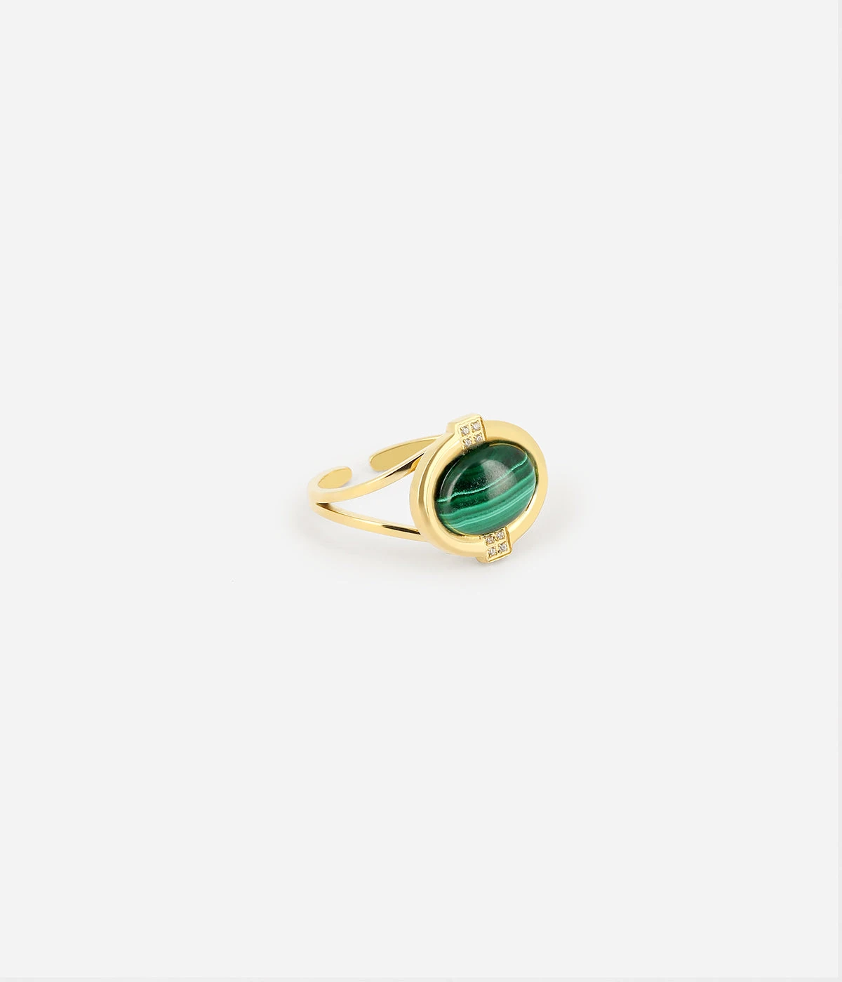 Bague en acier doré à l’or fin sur laquelle un cabochon de pierre naturelle est attaché. De petits zirconiums sont également sertis.