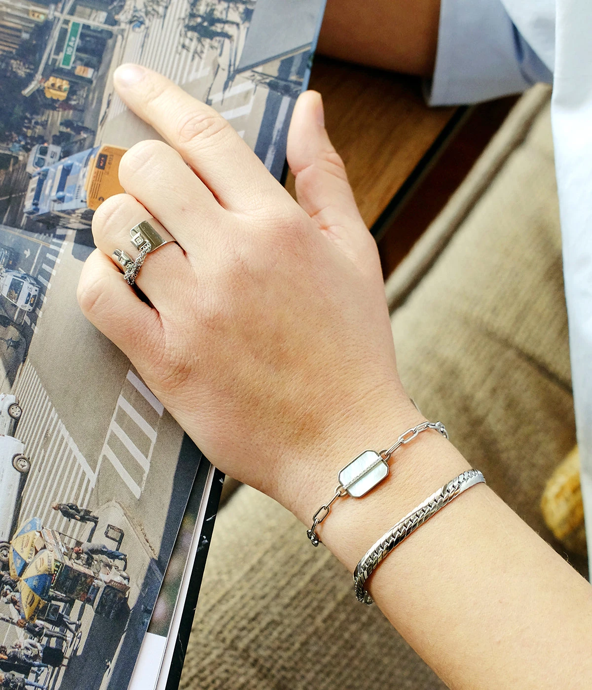Bague en acier uni ou doré à l’or fin. Aux extrémités se trouvent un carré serti d’un zirconium, se reliant par trois petites chaînettes.
