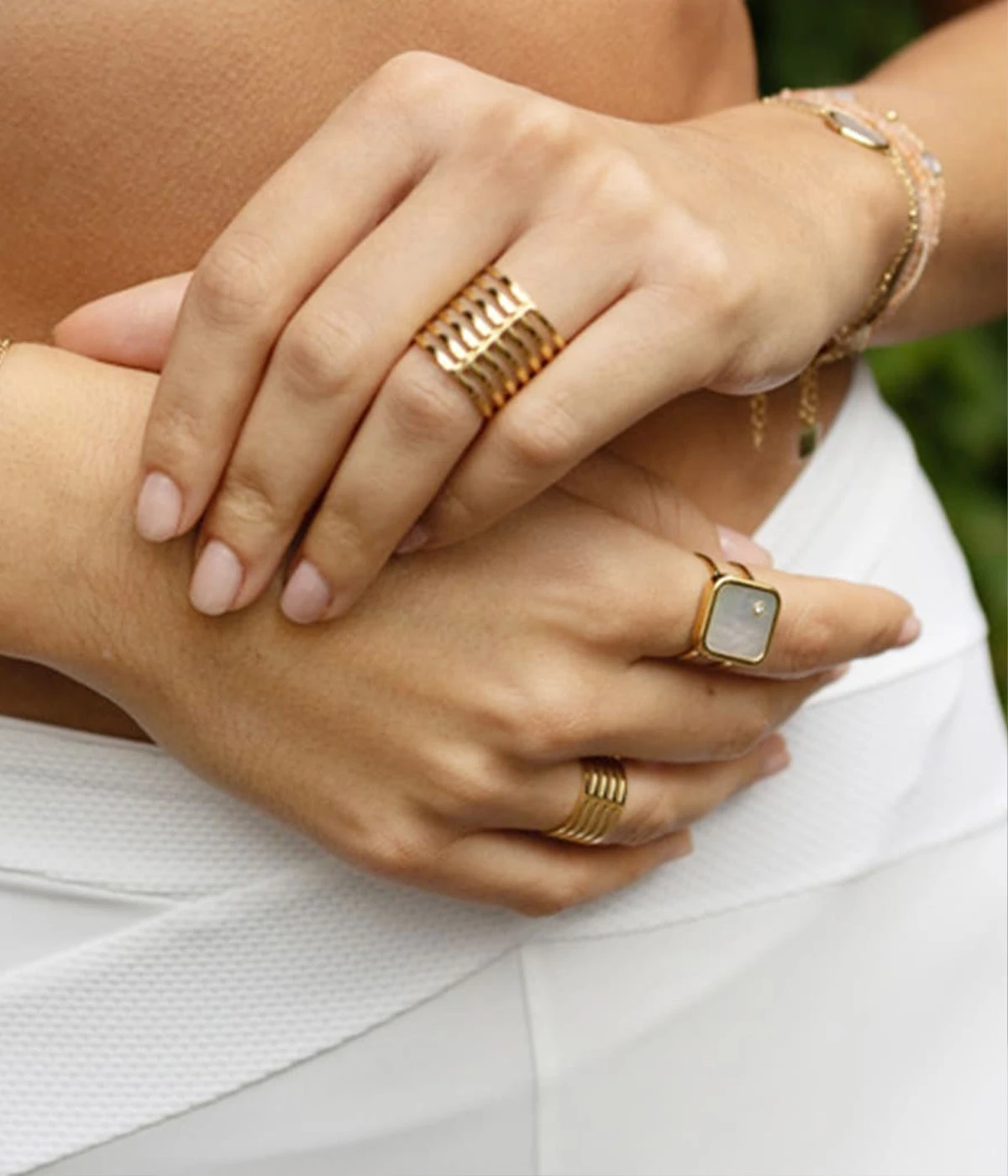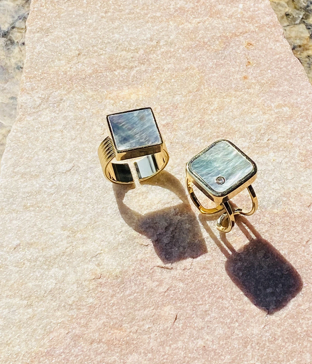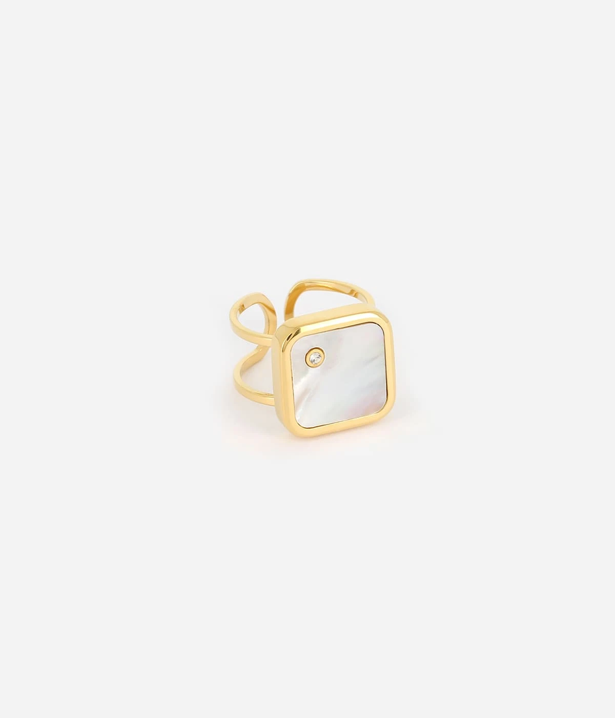 Bague ajustable en acier doré à l’or fin sur laquelle est attachée une pièce carrée en nacre sertie d’un zirconium.