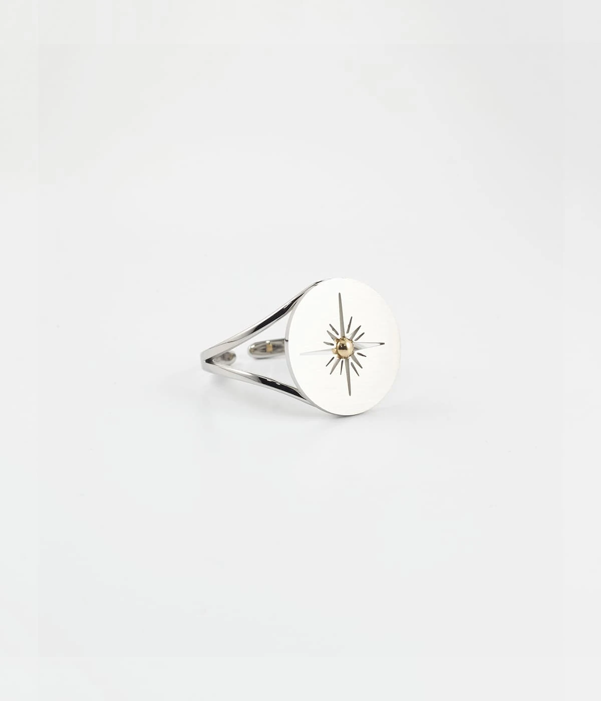 Bague ajustable en acier uni ou doré à l’or fin formée d’une large médaille finement gravée.