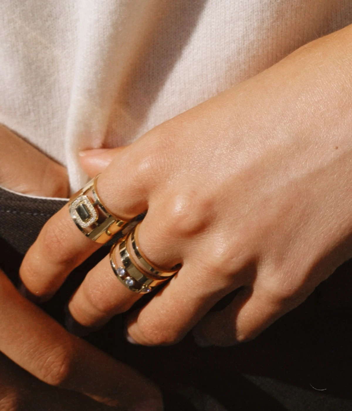 Bague large ajustable en acier uni ou doré à l’or fin avec en son centre une forme rectangulaire sertie de zirconiums.