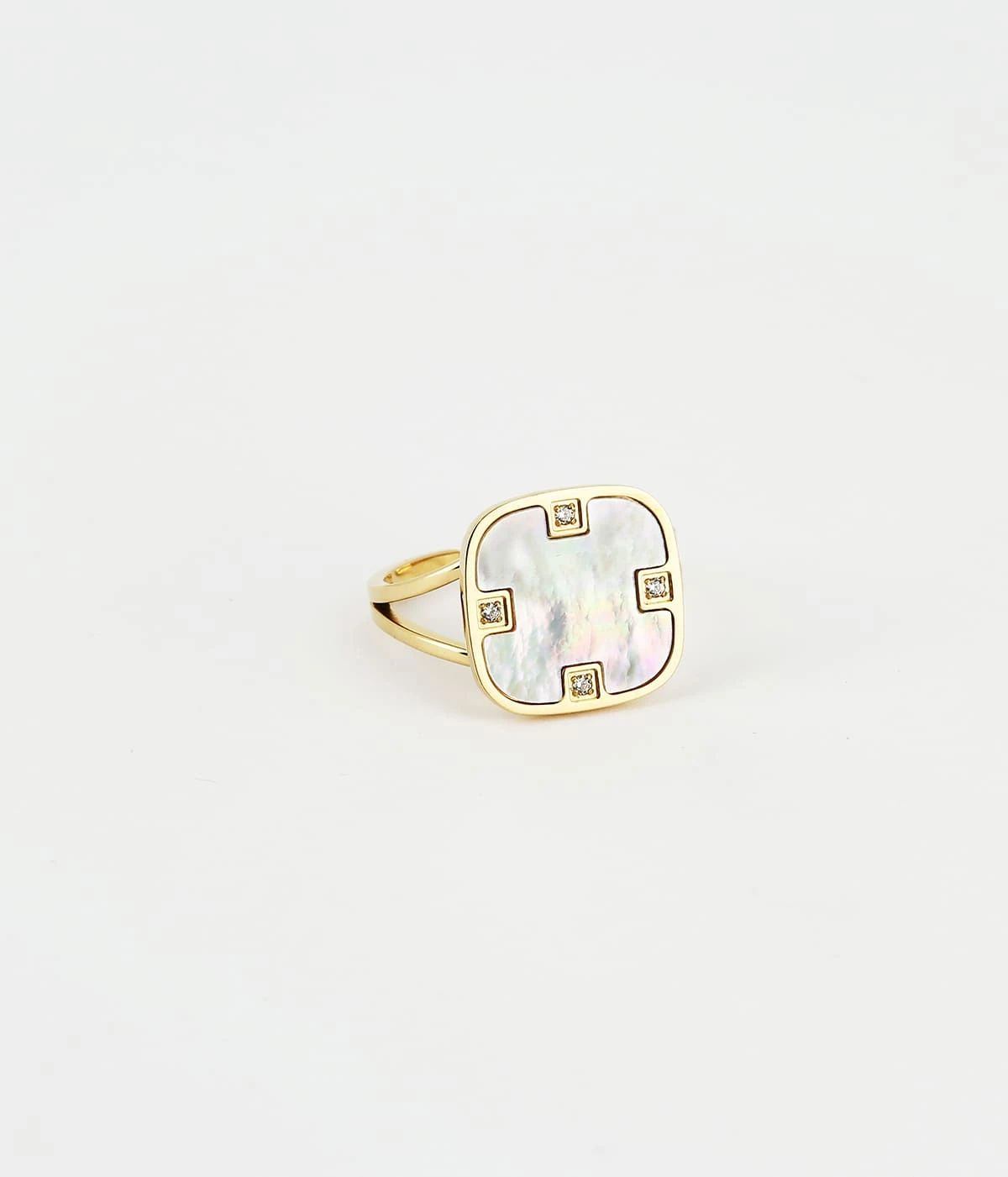 Bague en acier uni ou doré à l’or fin, composée d’une plaque en nacre, sertie de zirconiums.