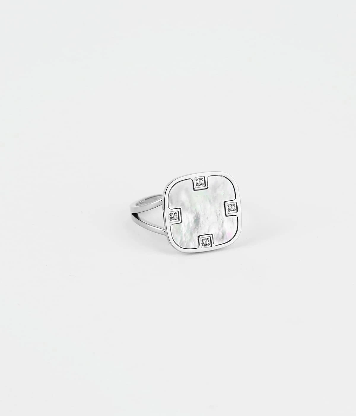 Bague en acier uni ou doré à l’or fin, composée d’une plaque en nacre, sertie de zirconiums.