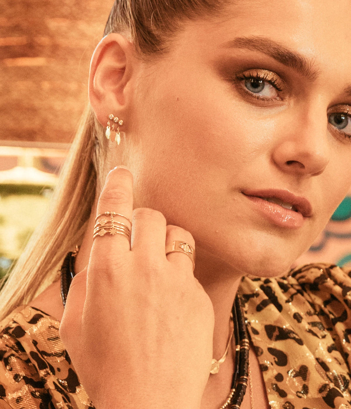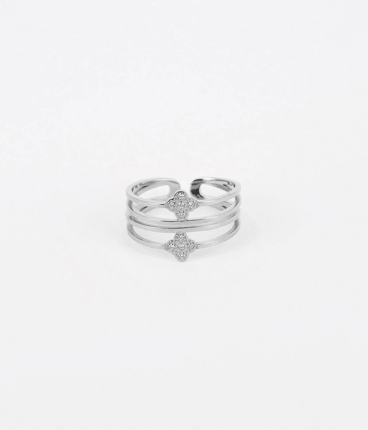 Bague ajustable en acier uni ou doré à l’or fin formée de plusieurs anneaux réunis ensemble par deux motifs de zirconiums sertis.