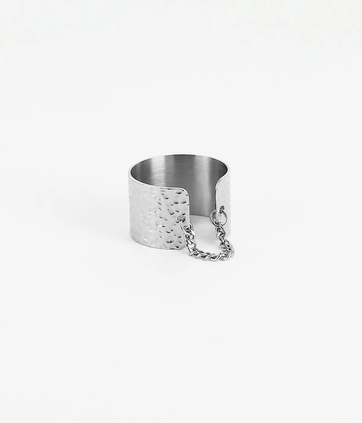 Bague jonc ajustable en acier uni ou doré à l’or fin dont la matière est finement texturée, accompagnée d’une chaînette reliant les deux bouts.
