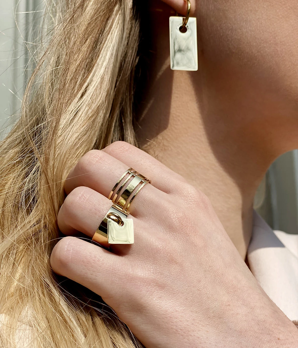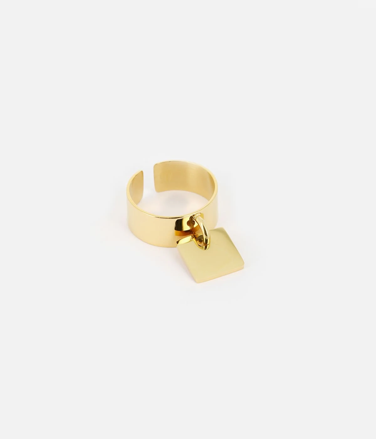 Bague ajustable en acier uni ou doré à l’or fin sur laquelle est attachée une pampille en forme de carré.