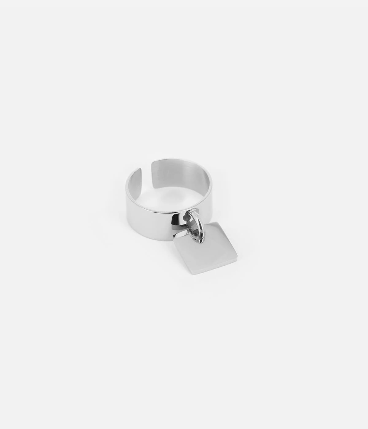 Bague ajustable en acier uni ou doré à l’or fin sur laquelle est attachée une pampille en forme de carré.
