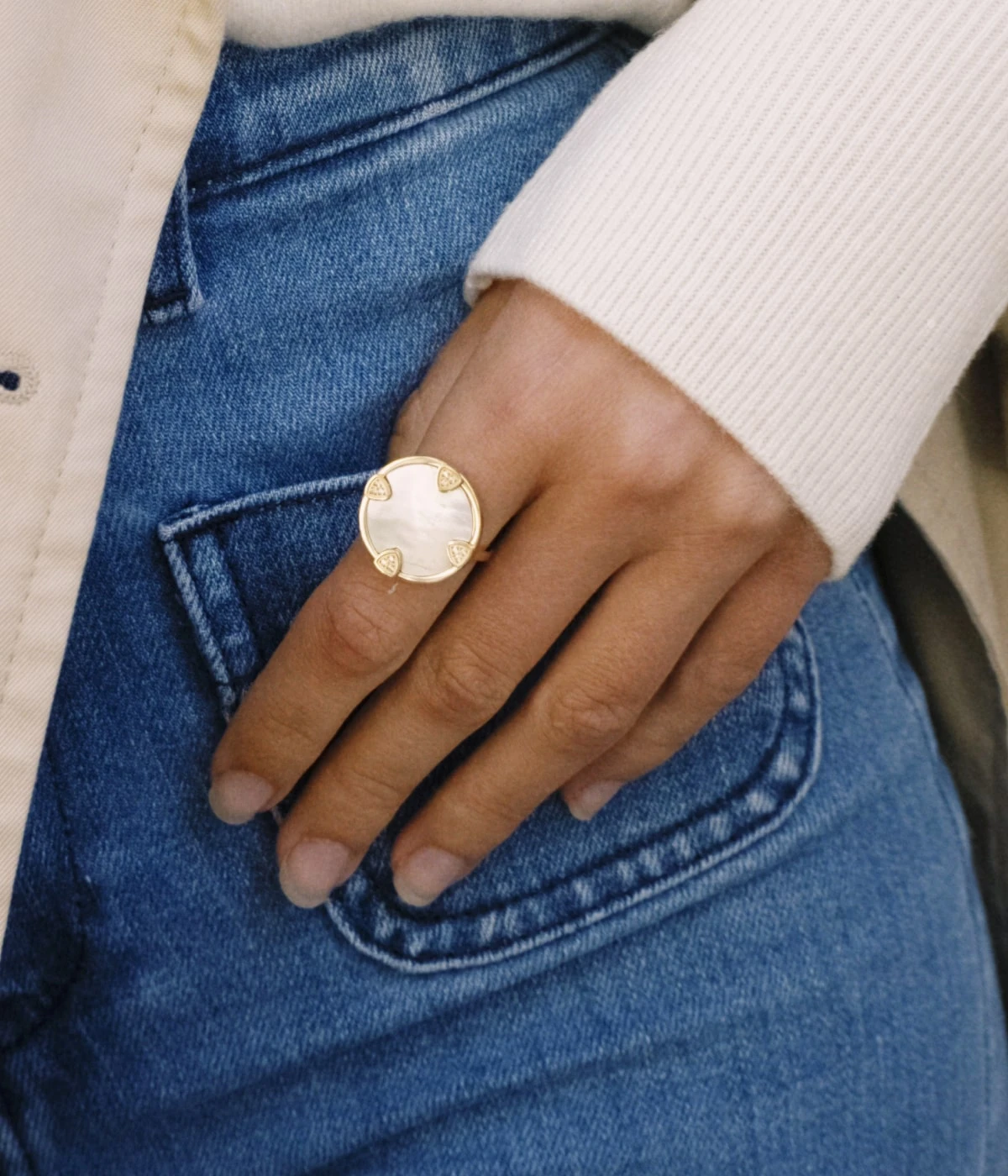 Bague ajustable en acier doré à l’or fin sur laquelle se trouve une plaque de nacre et quatre triangles de zirconiums en sertis clos.