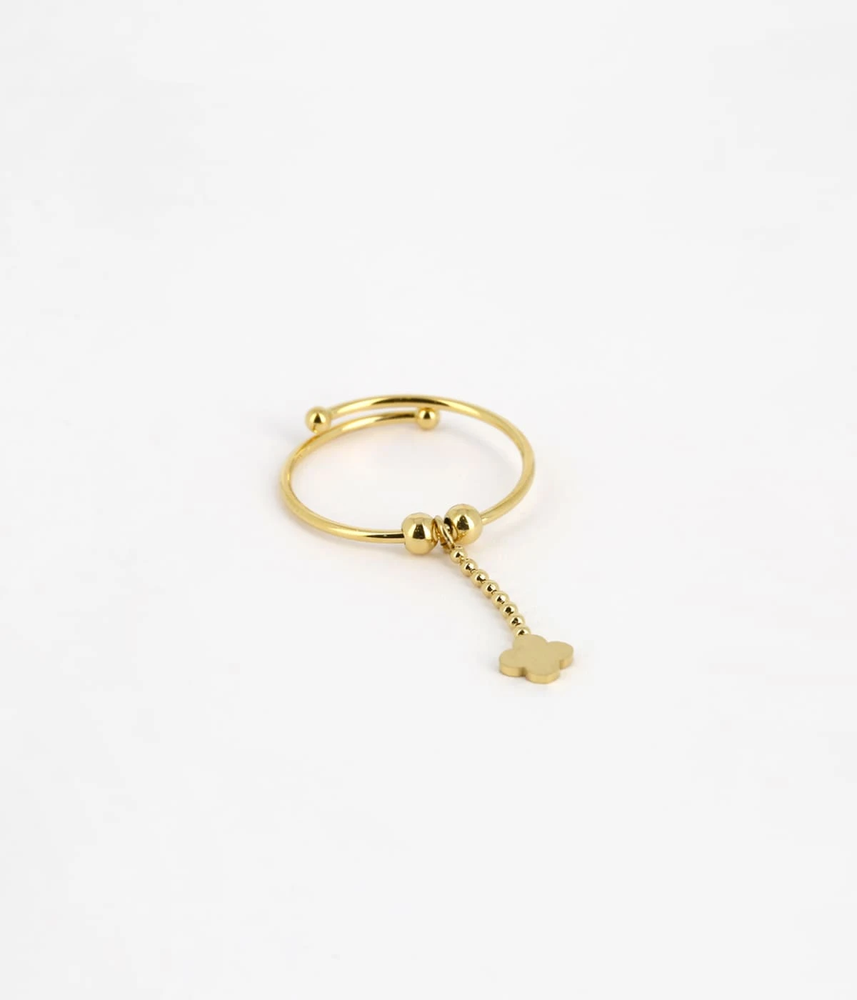 Bague ajustable en acier uni ou doré à l’or fin. Cette bague est sertie de deux petites boules et d’un charmant petit trèfle.