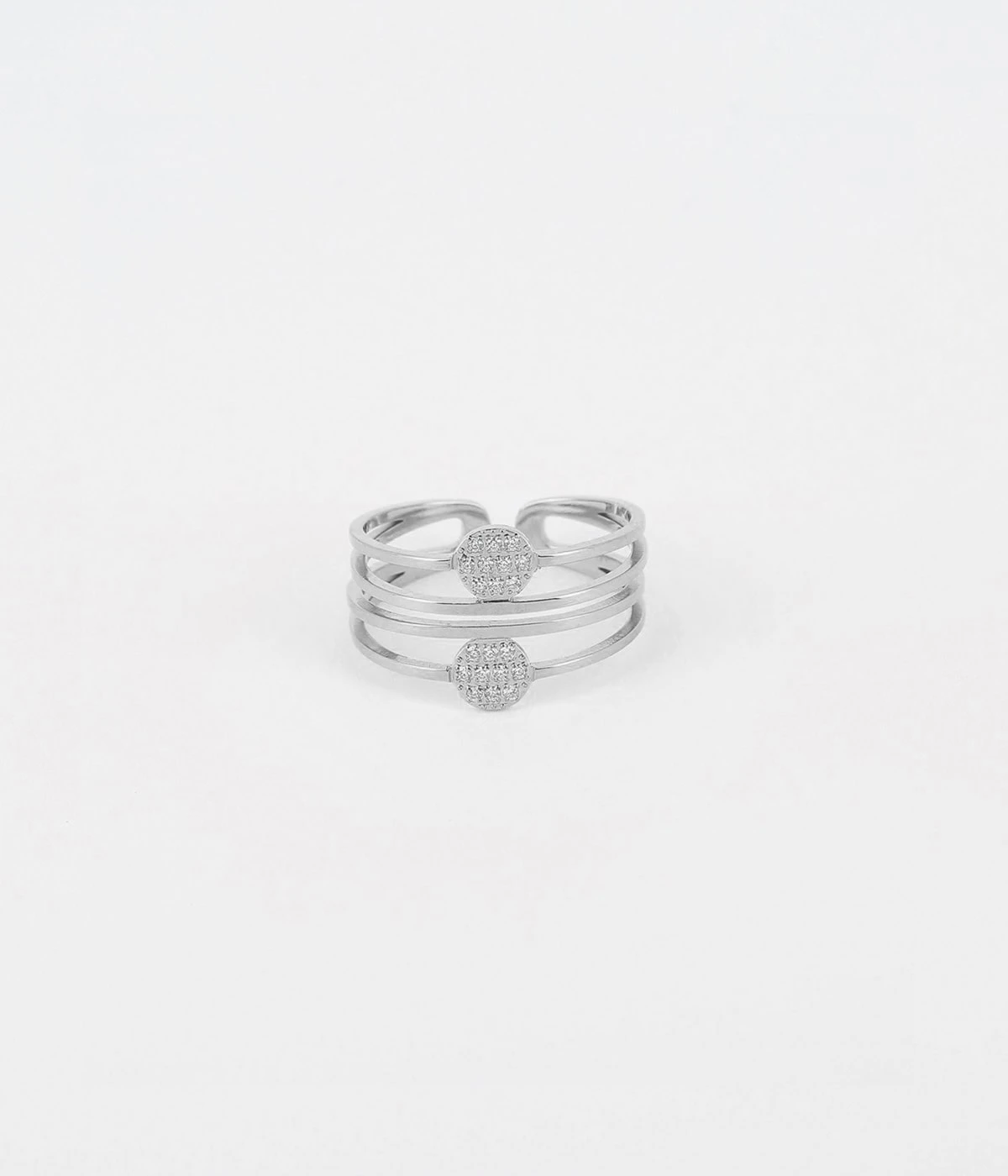 Bague ajustable en acier uni ou doré à l’or fin formée de plusieurs anneaux réunis ensemble par deux motifs de zirconiums sertis.
