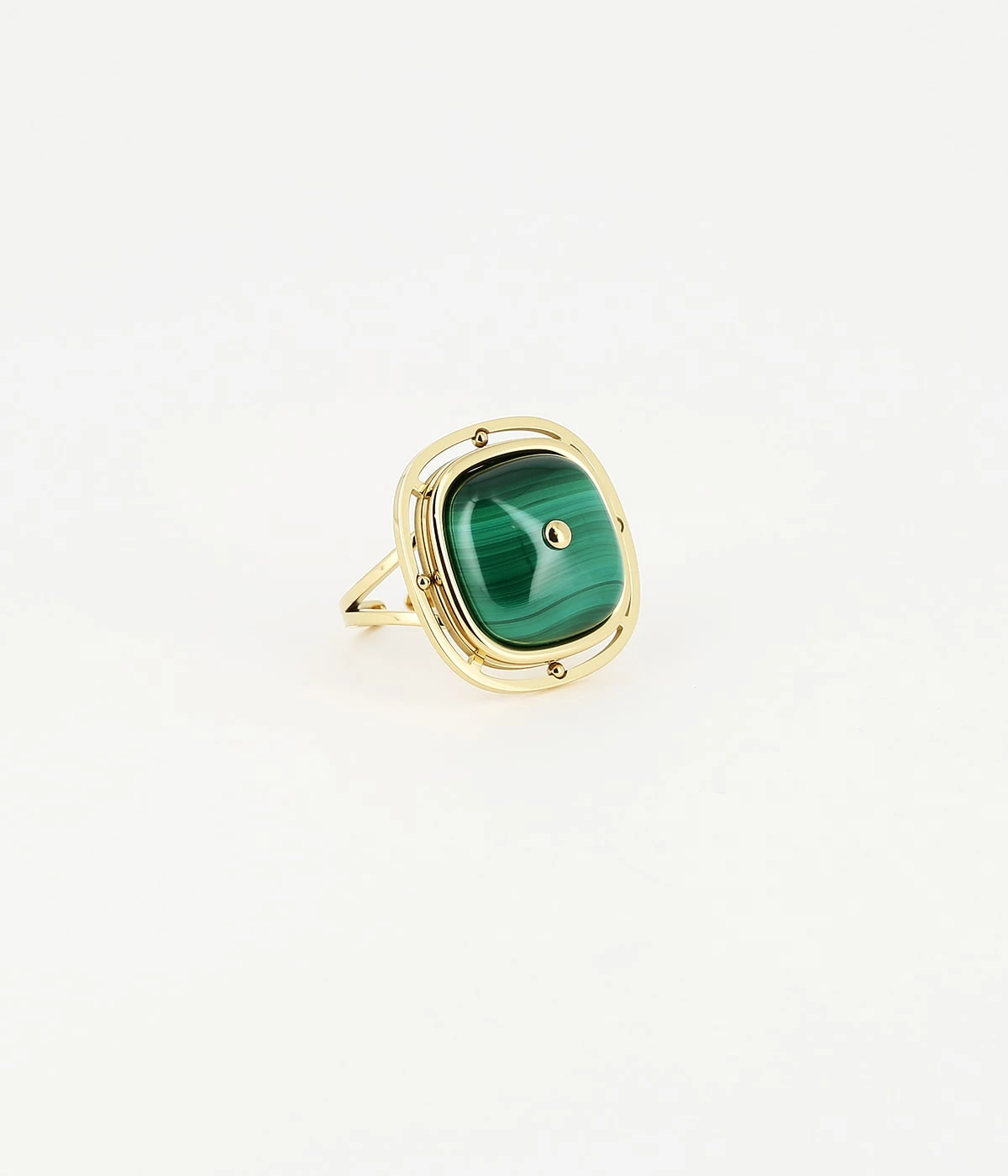 Bague ajustable en acier doré à l’or fin sur laquelle est attachée une plaque possédant une pierre naturelle piquée en son centre d’une boule d’acier.