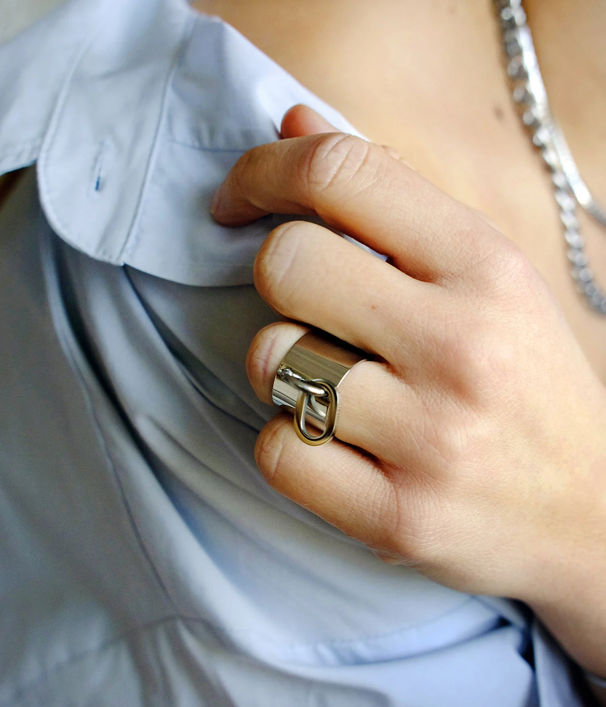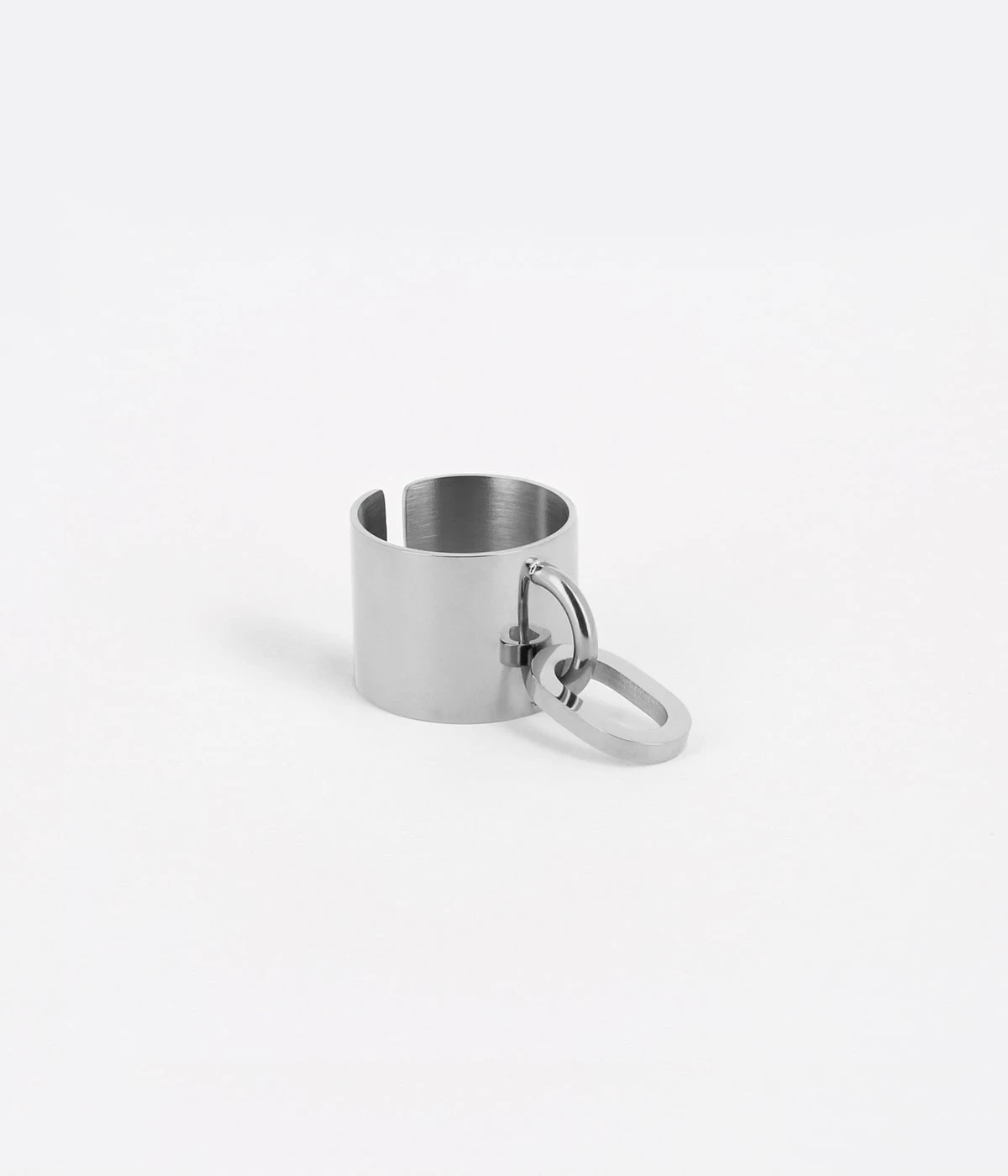 Bague ajustable en acier uni ou doré à l’or fin sur laquelle est accroché en son centre un anneau mobile.
