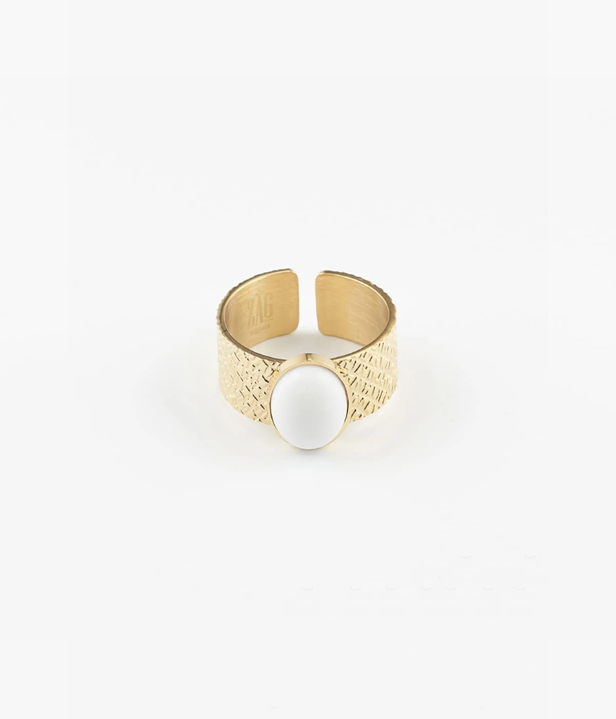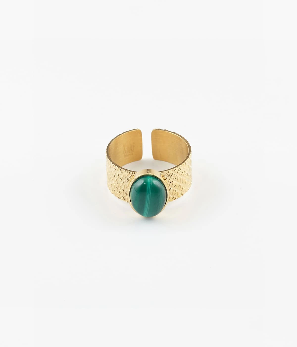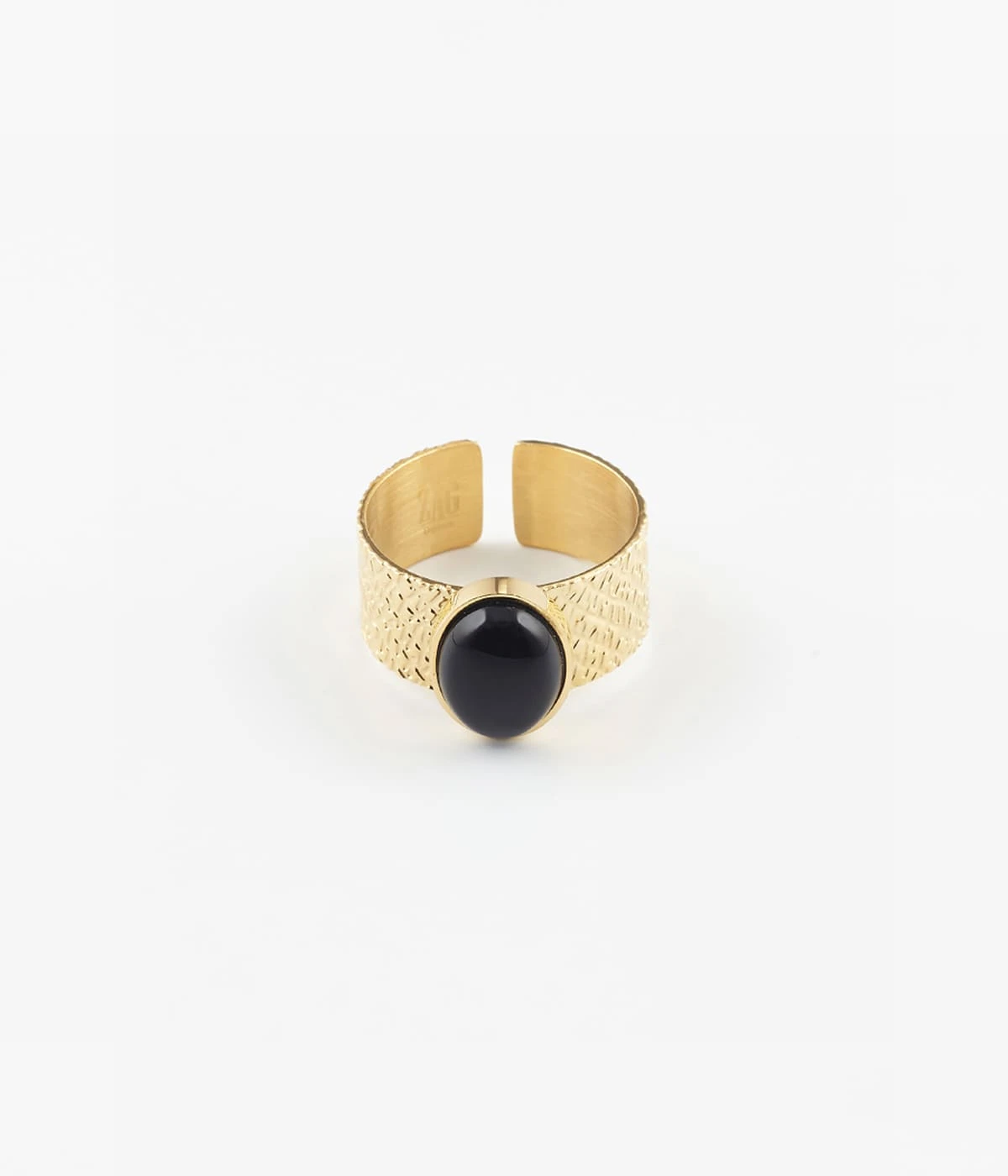 Bague ajustable en acier doré à l’or fin à l’aspect finement texturé, ornée d’une pierre naturelle en serti clos.