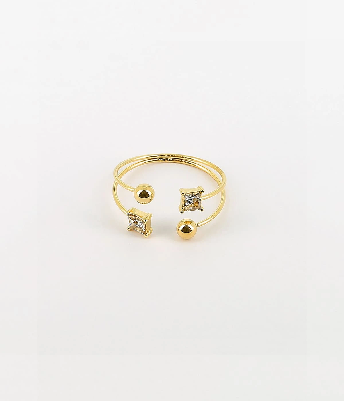 Bague en acier uni ou doré à l’or fin ajustable formée de deux anneaux terminés de motifs carrés pavés de zirconiums.