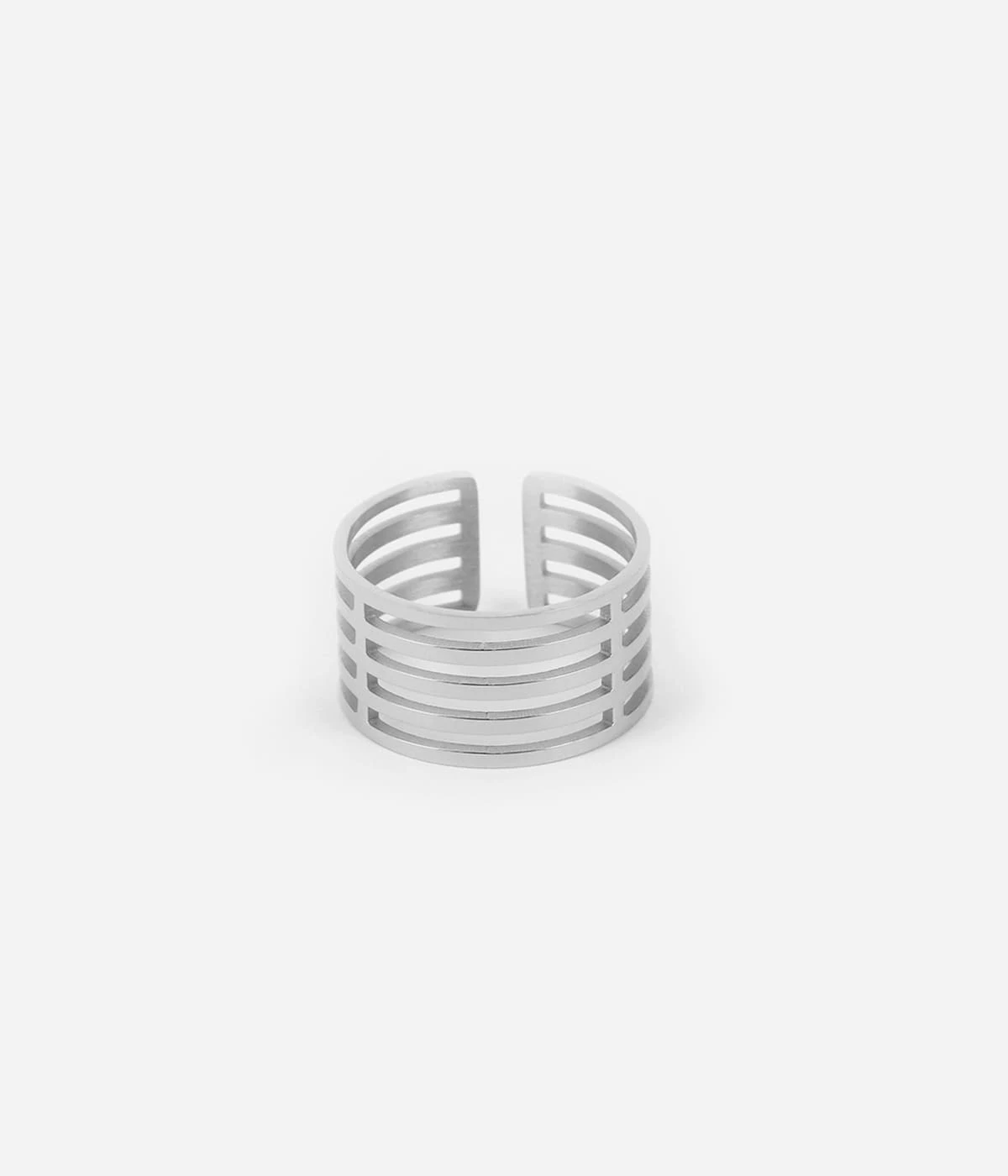 Bague large ajustable en acier uni ou doré à l’or fin à l’allure d’un cylindre.