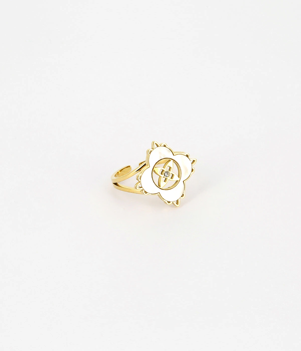Bague en acier doré à l’or fin sur laquelle une fleur en nacre est sertie d’un zirconium en son centre.