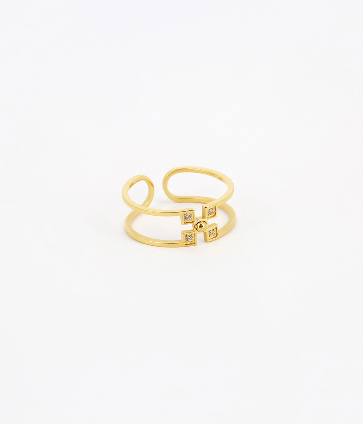 Bague fine ajustable en acier doré à l’or fin sertie de zirconiums.