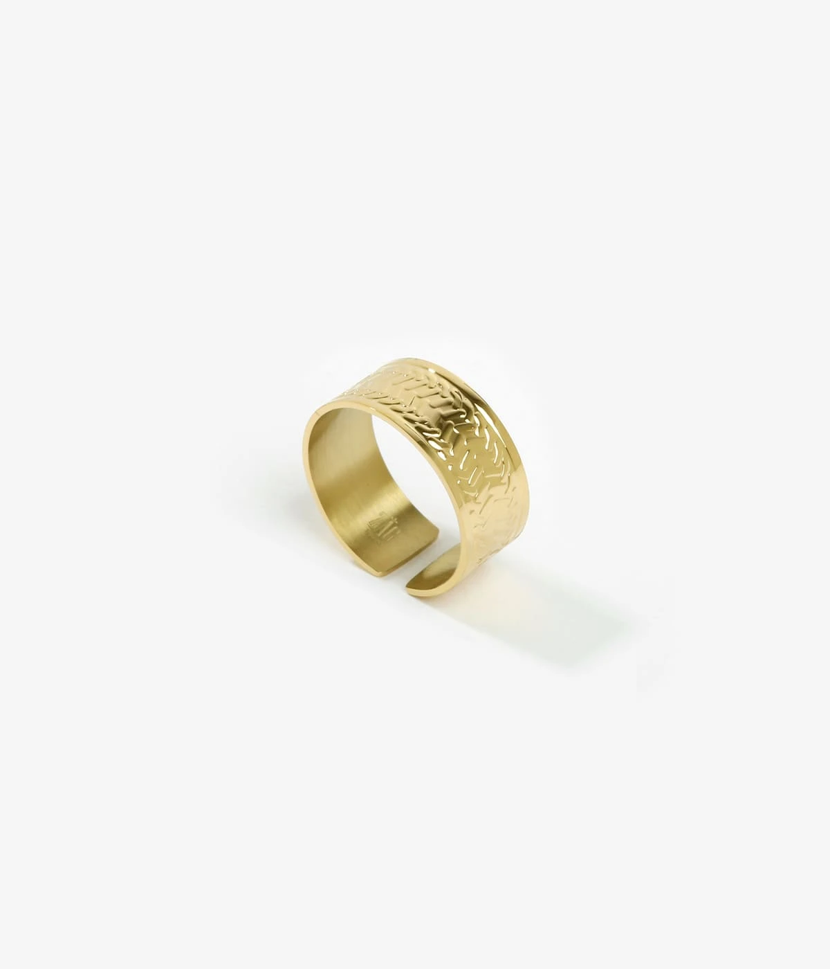 Cette anneau gravé d’un motif à chevron, est une pièce classique et chic.