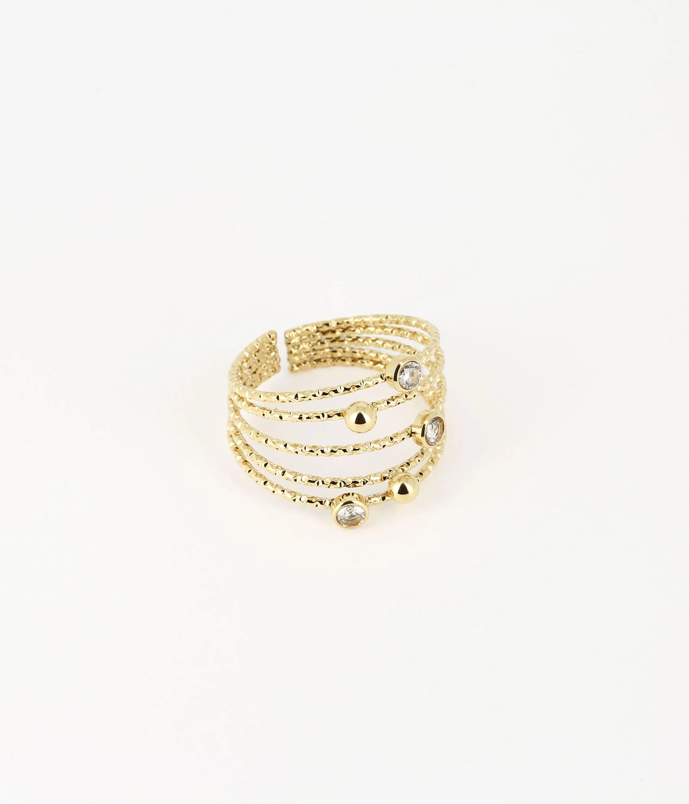 Bague en acier uni ou doré à l’or fin sertie de zirconiums et de petites boules d’acier. Délicate et ludique cette bague est formée de plusieurs anneaux rassemblés.