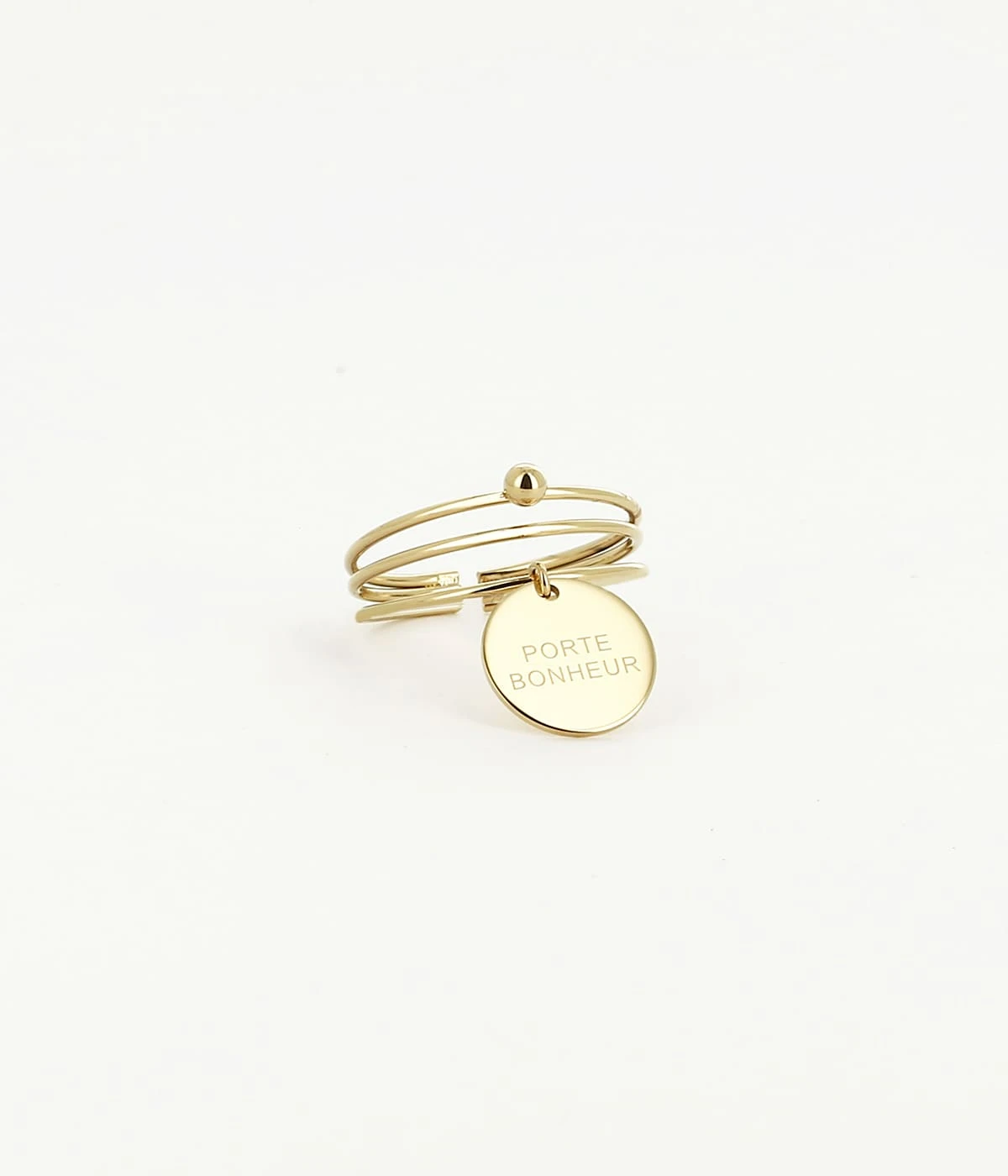 Cette bague est formée de 3 rangs avec un médaillon gravé du mot “Porte Bonheur”.