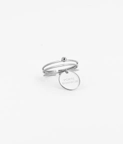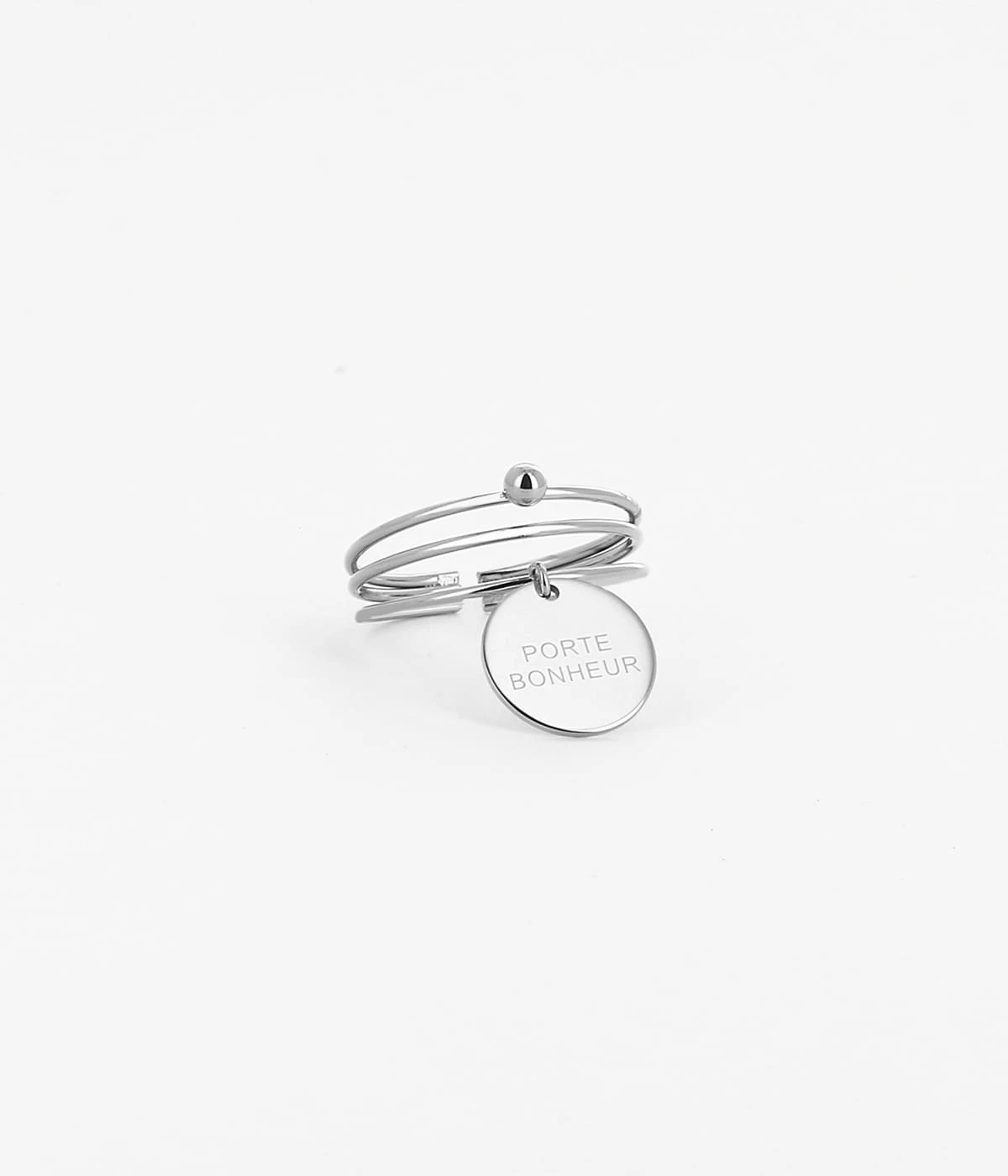 Cette bague est formée de 3 rangs avec un médaillon gravé du mot “Porte Bonheur”.