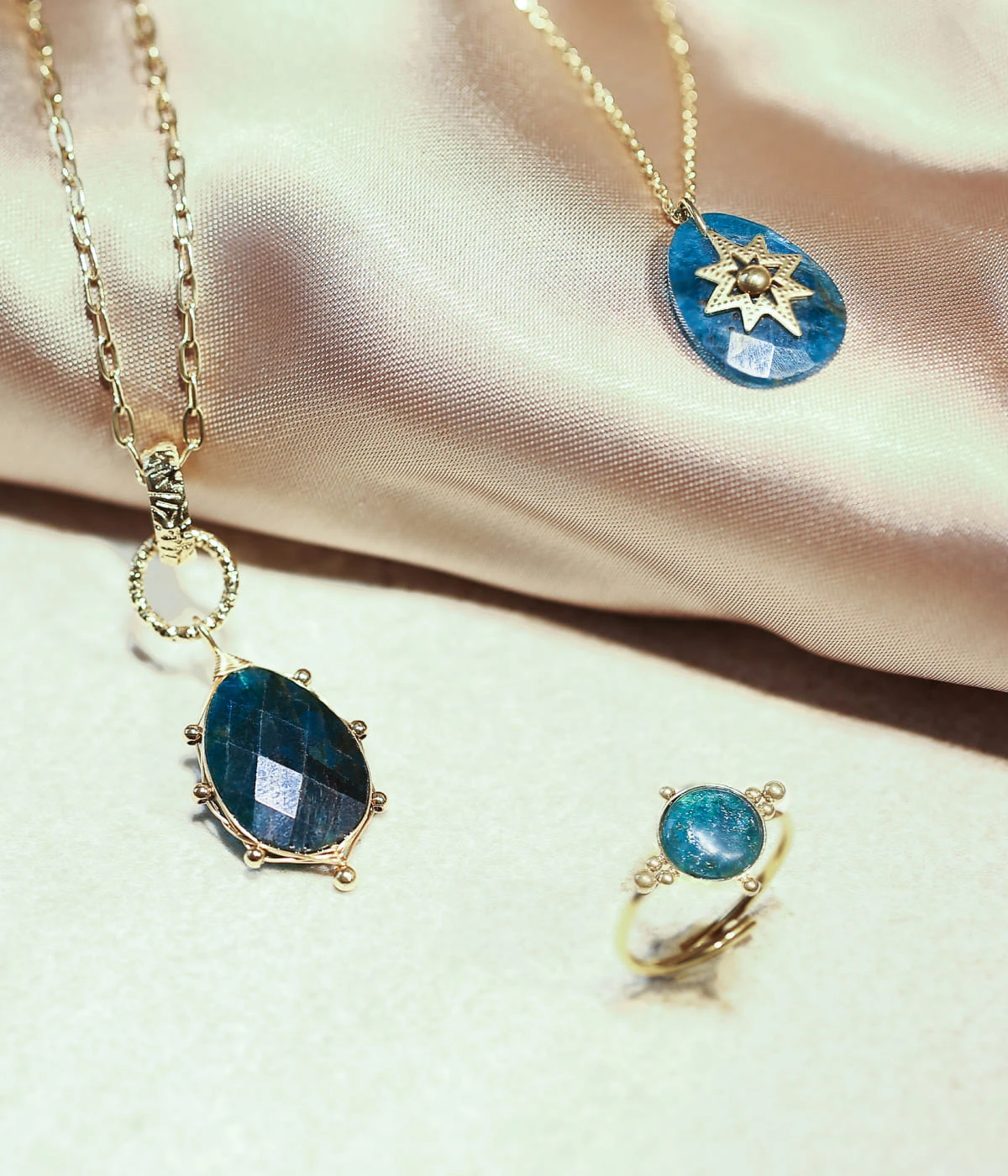 - Déclinée en boucles d’oreilles, bracelet et collier