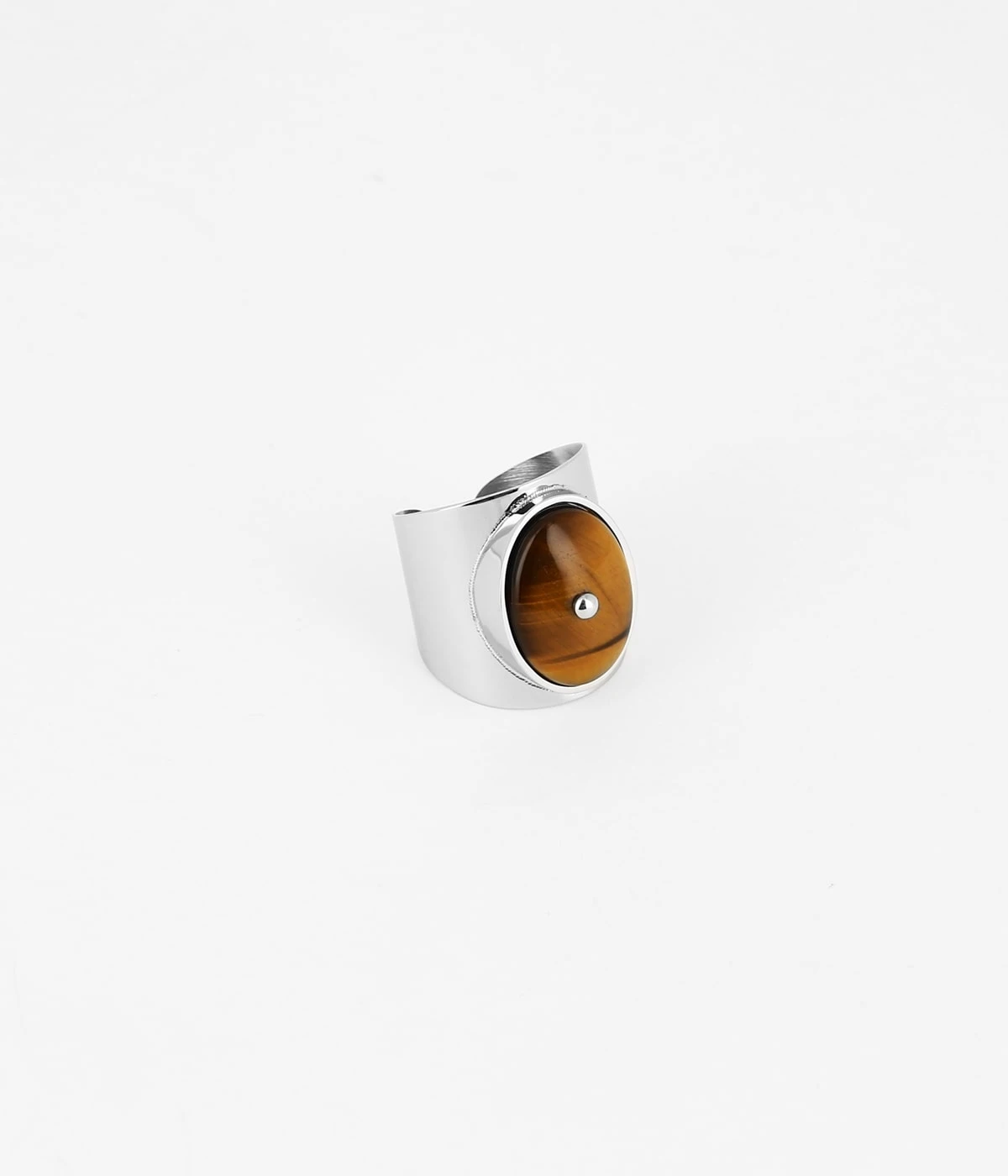 Bague large ajustable en acier uni composée d’une pierre naturelle piquée d’une boule d’acier au centre.