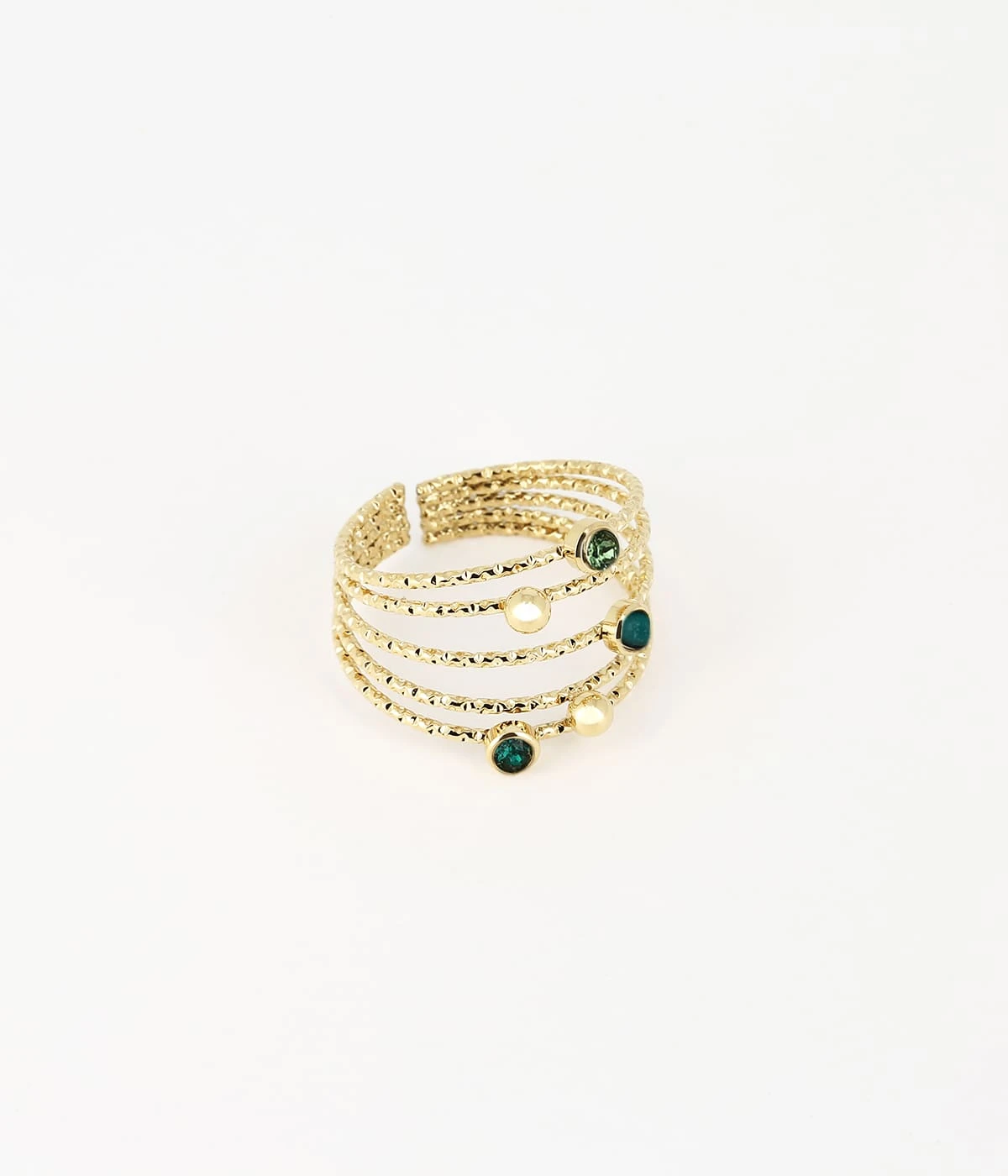 Bague en acier uni ou doré à l’or fin sertie de zirconiums colorés et de petites boules d’acier.