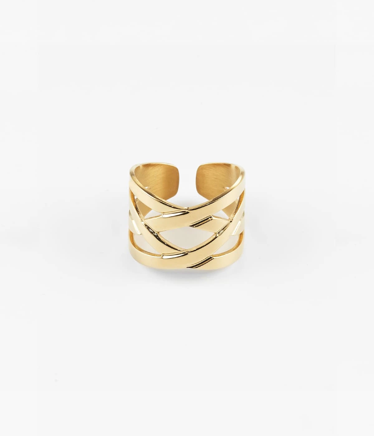 Bague ajustable en acier uni ou doré à l’or fin en forme de large tresse.