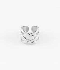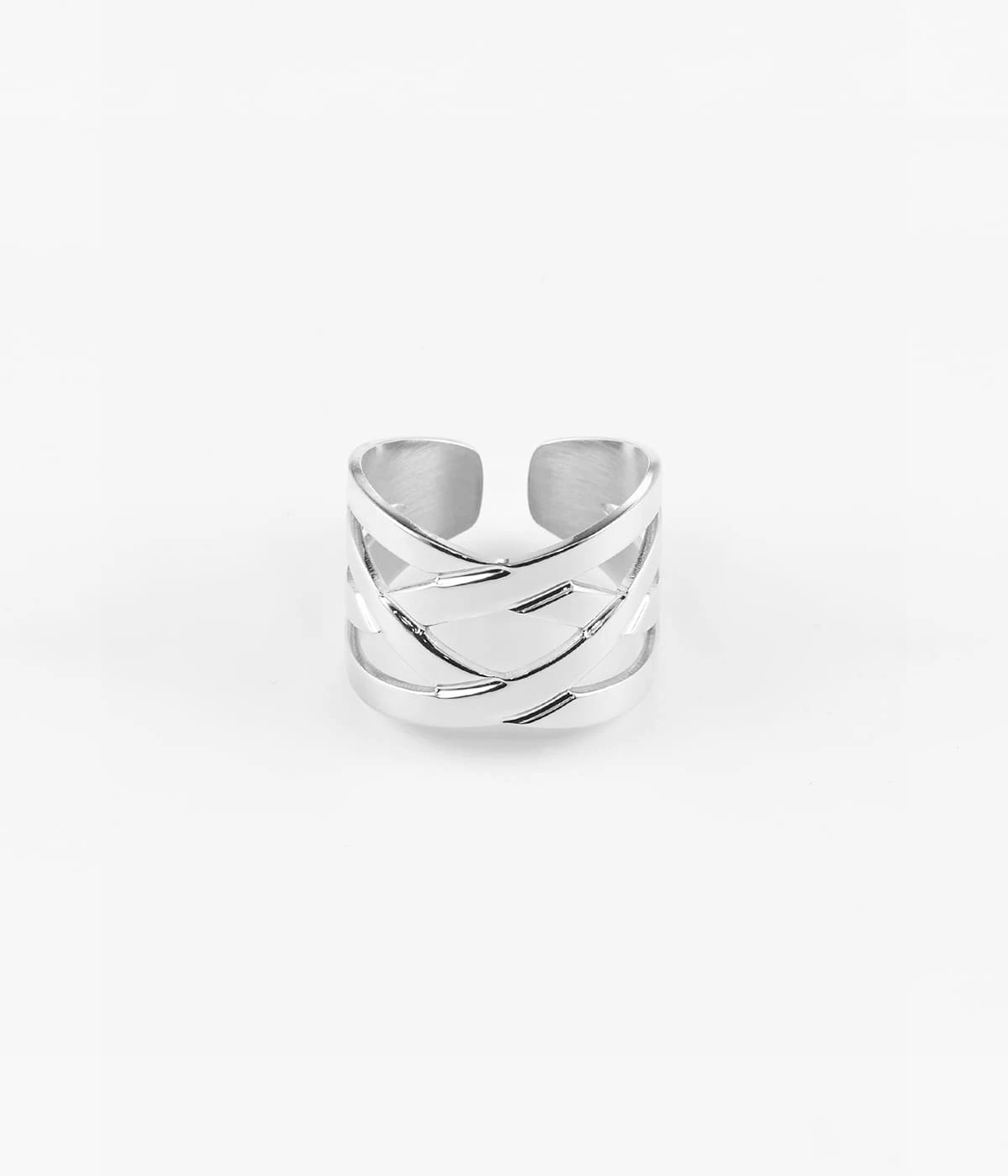 Bague ajustable en acier uni ou doré à l’or fin en forme de large tresse.