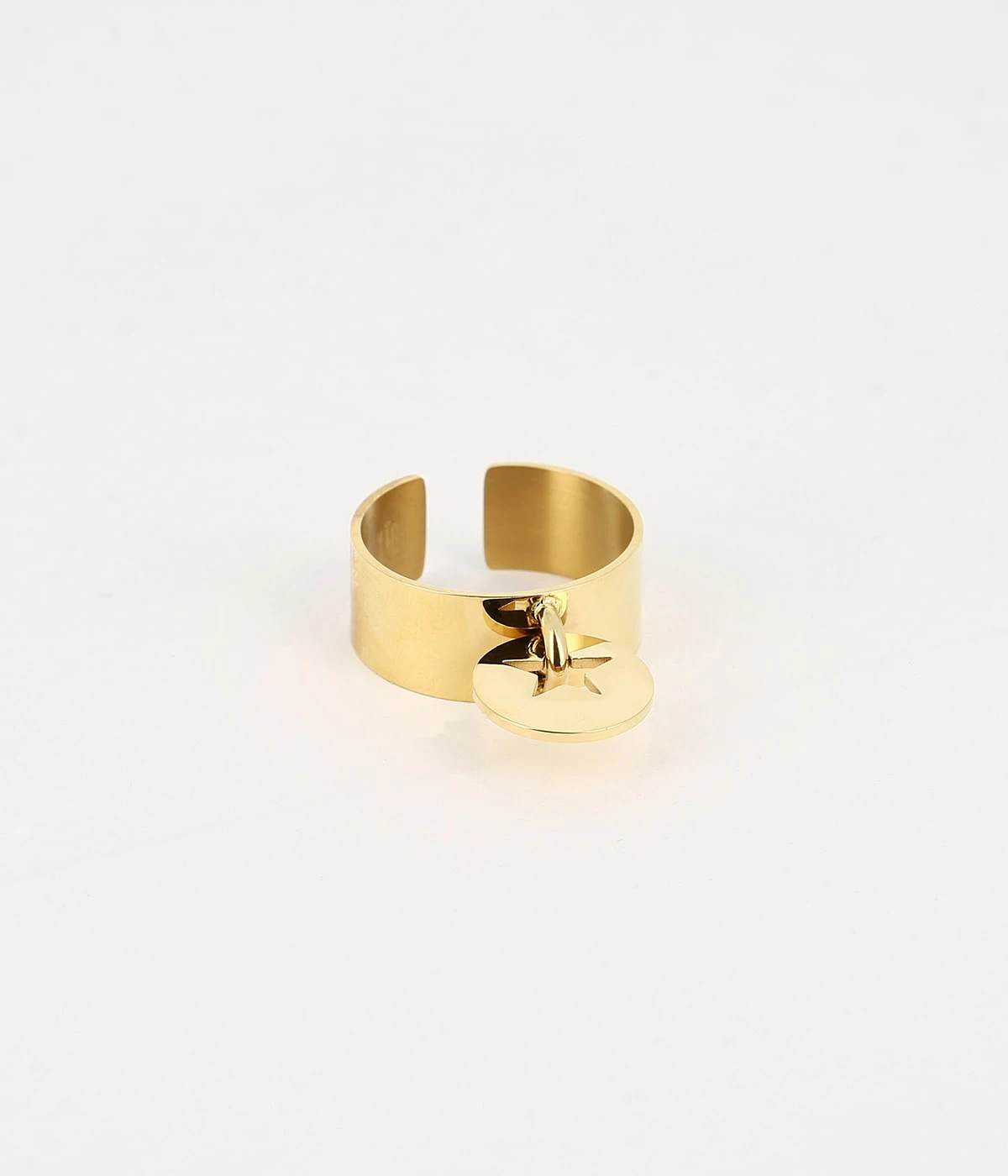 Bague ajustable en acier uni sur laquelle est accroché en son centre un anneau mobile gravé d’une étoile.