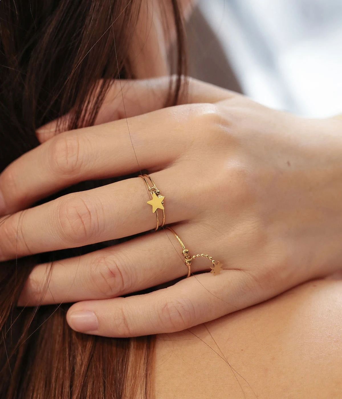Bague ajustable en acier uni ou doré à l’or fin. Cette bague est sertie de deux petites boules et d’une charmante petite étoile.