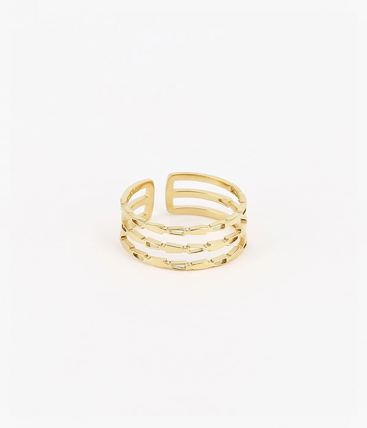 Bague ajustable en acier uni ou doré à l’or fin formée de trois anneaux finement martelés.