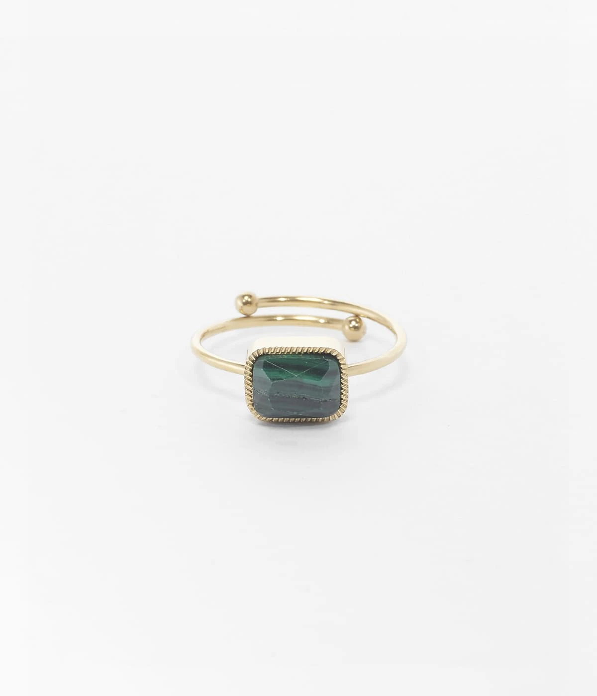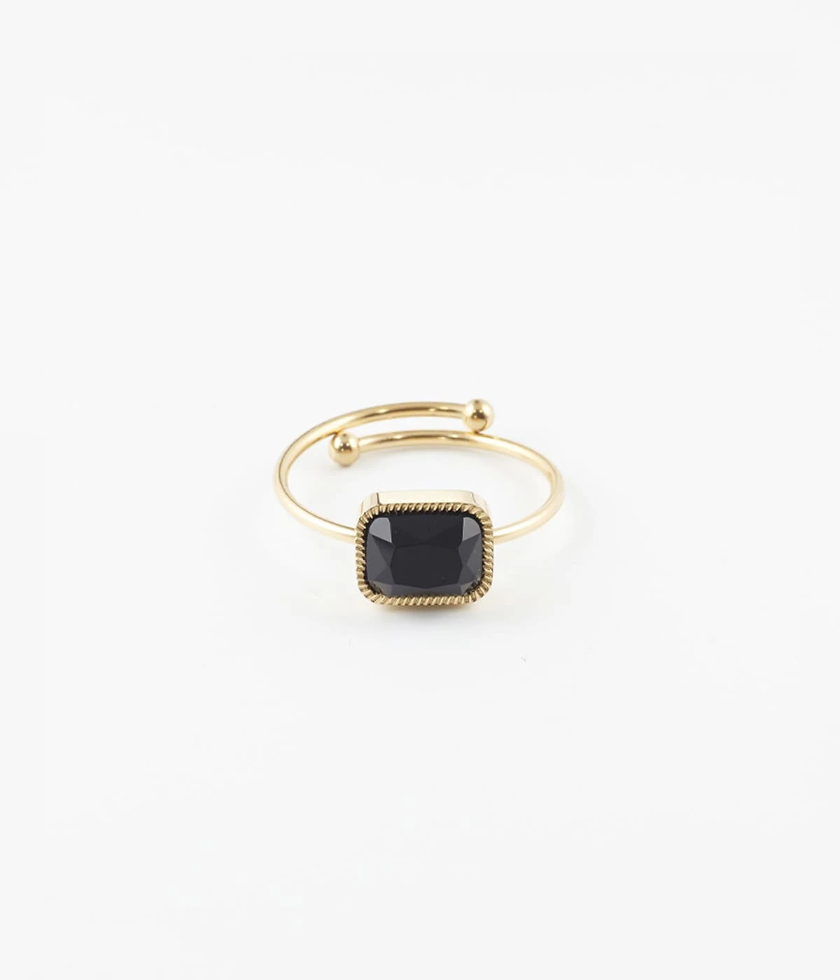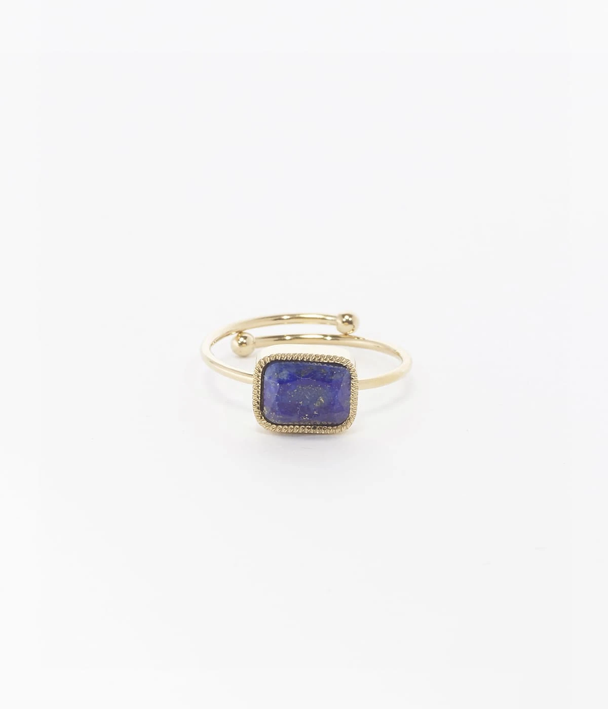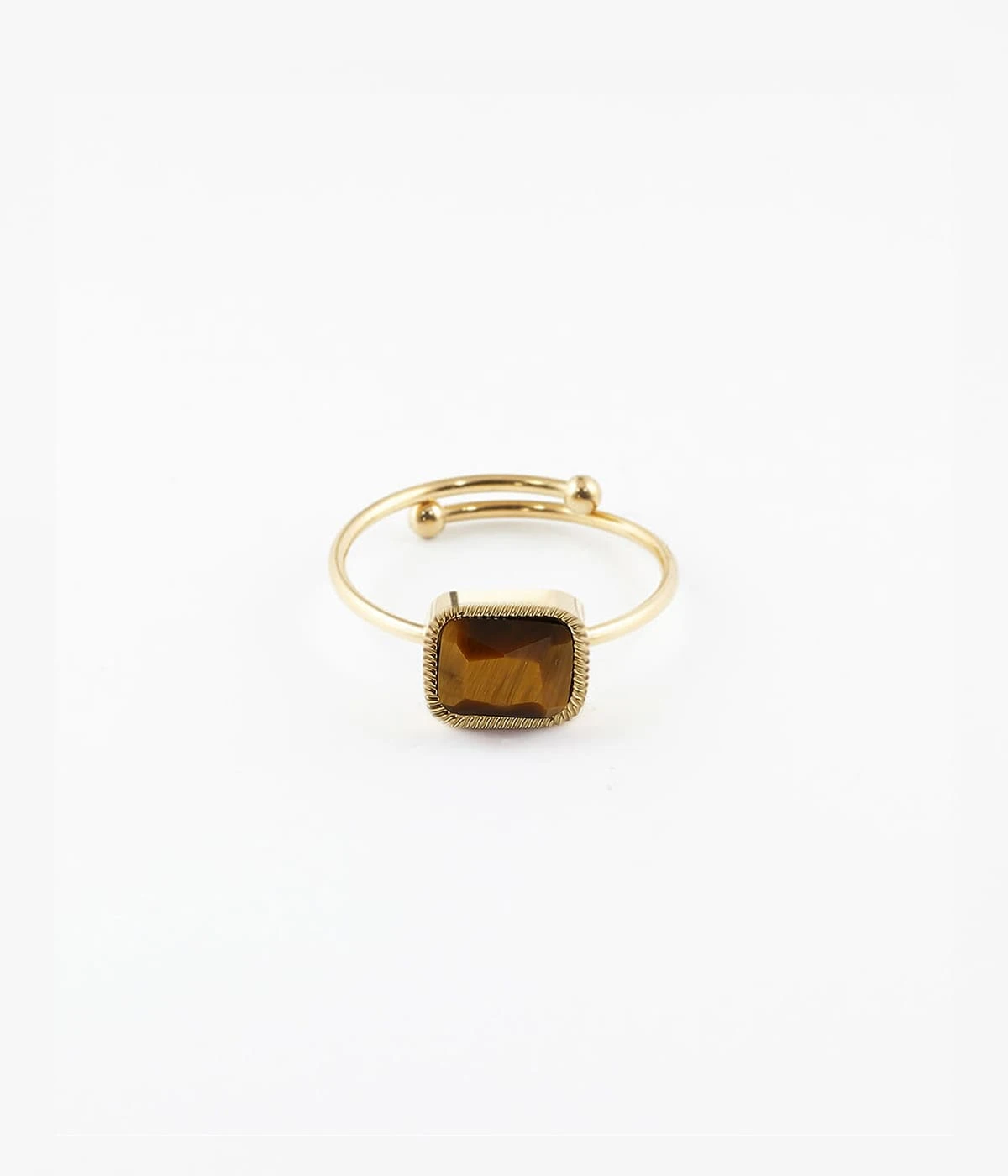 Bague ajustable en acier doré à l’or fin sur laquelle est montée une pierre naturelle.