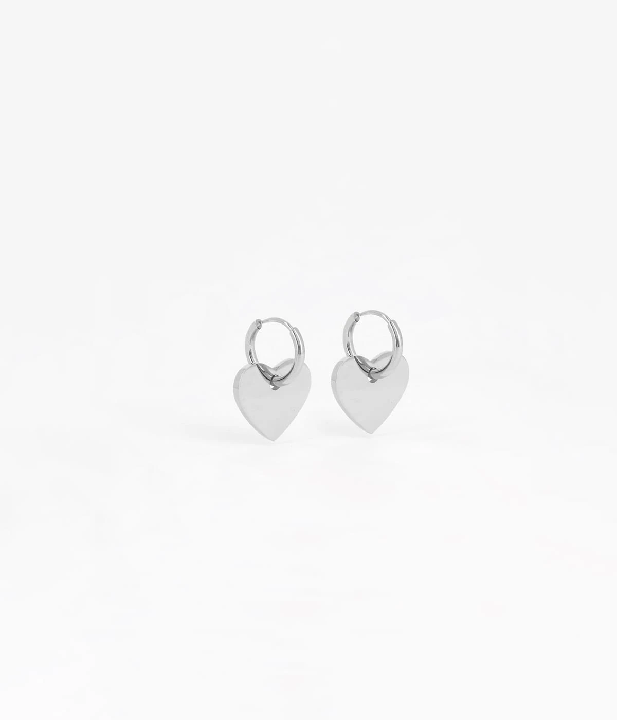 Boucles d’oreilles créoles en acier uni ou doré à l’or fin sur lesquelles est suspendu une plaque en métal en forme de cœur.