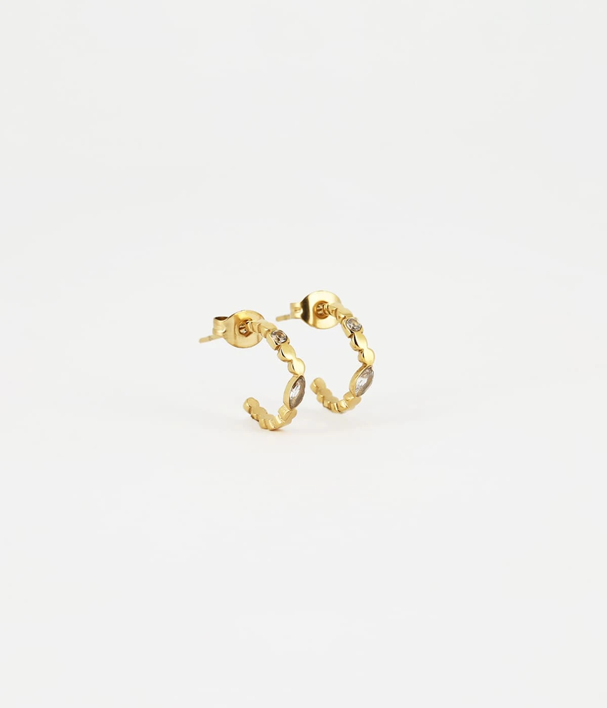 Boucles d’oreilles mini créoles en acier uni ou doré à l’or fin sur lesquelles sont sertis des petits zirconiums brillants.