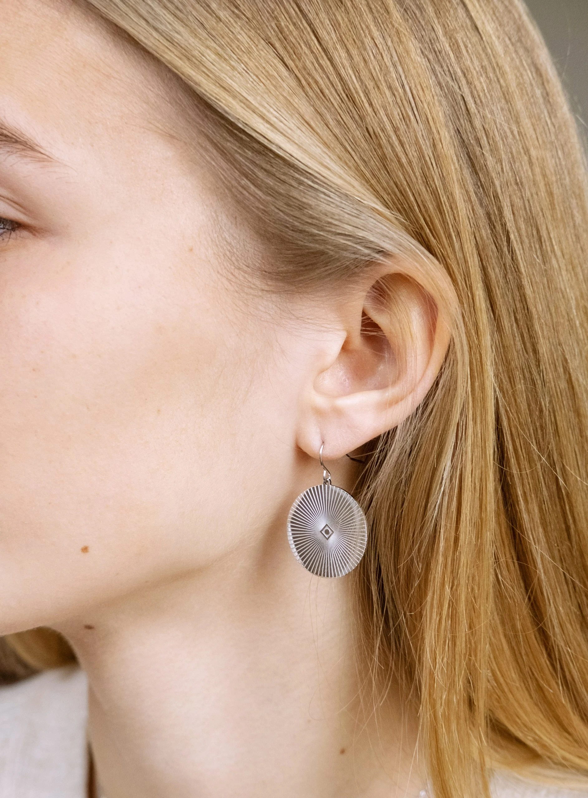 Boucles d’oreilles dormeuses en acier uni ou doré à l’or fin. Est attachée sur chaque dormeuses une pastille de métal gravé de lignes concentriques donnant l’effet de rayons de soleil.