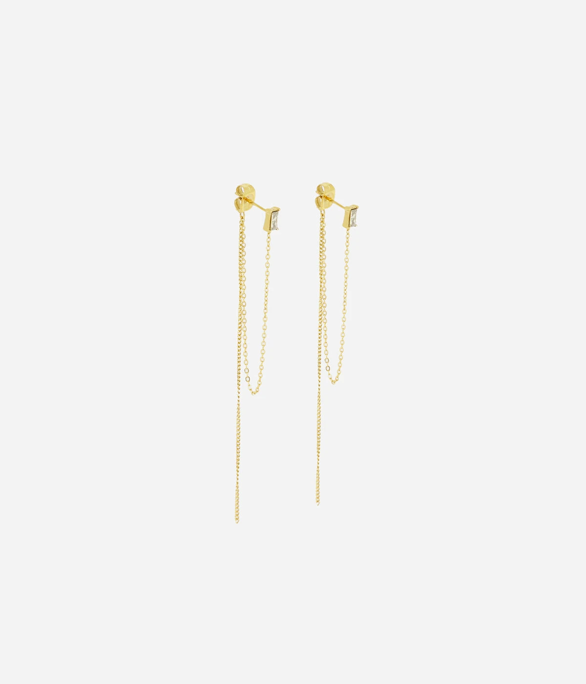 Boucles d’oreilles en acier uni ou doré à l’or fin, présentant un petit rectangle de zirconium reliant une chaînette au fermoir papillon.