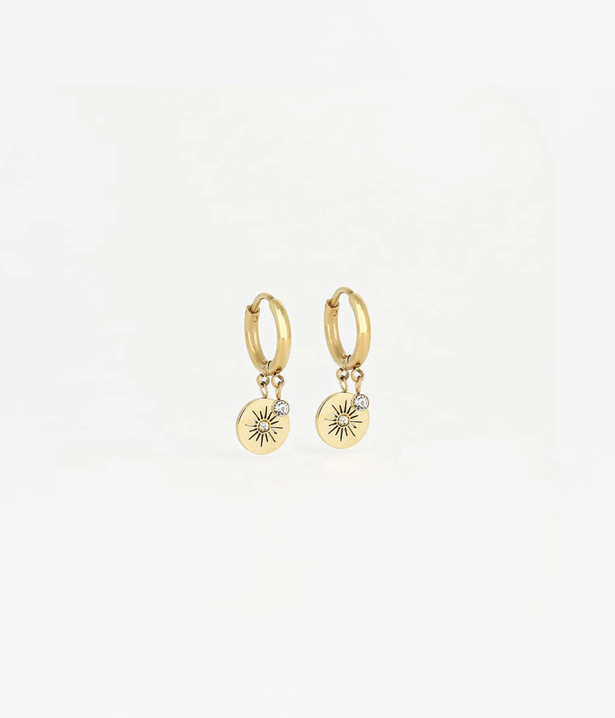 Boucles d’oreilles en acier uni ou doré à l’or fin sur lesquelles des médailles gravées d’un motif soleil et un petit zirconium sont attachés.