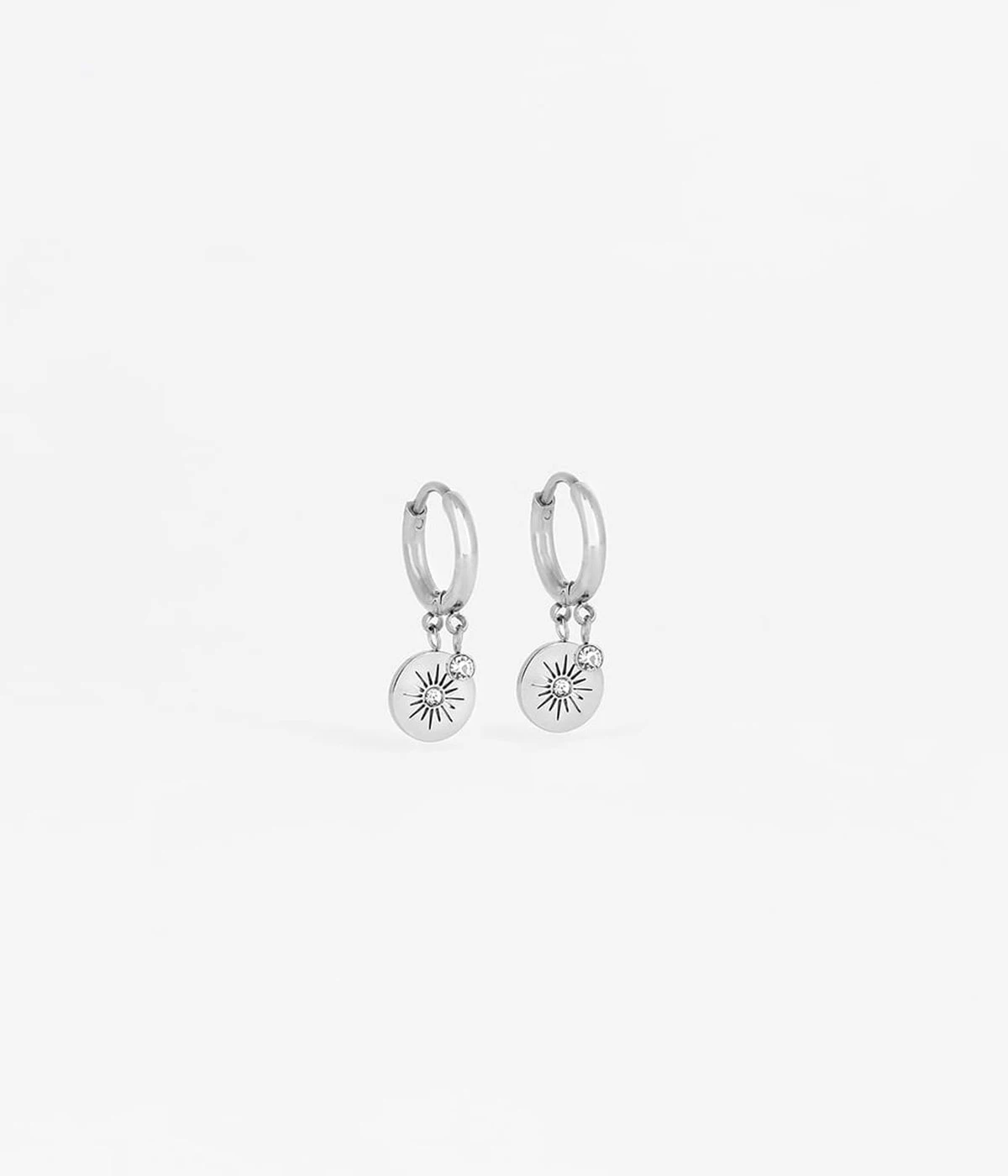 Boucles d’oreilles en acier uni ou doré à l’or fin sur lesquelles des médailles gravées d’un motif soleil et un petit zirconium sont attachés.
