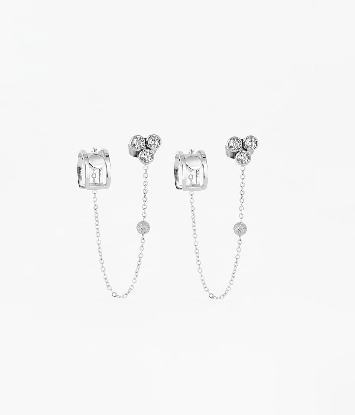 Boucles d’oreilles en acier uni ou doré dont la première partie est sertie de zirconiums et dont la deuxième se décline en un earcuff enfilable directement sur le lobe.