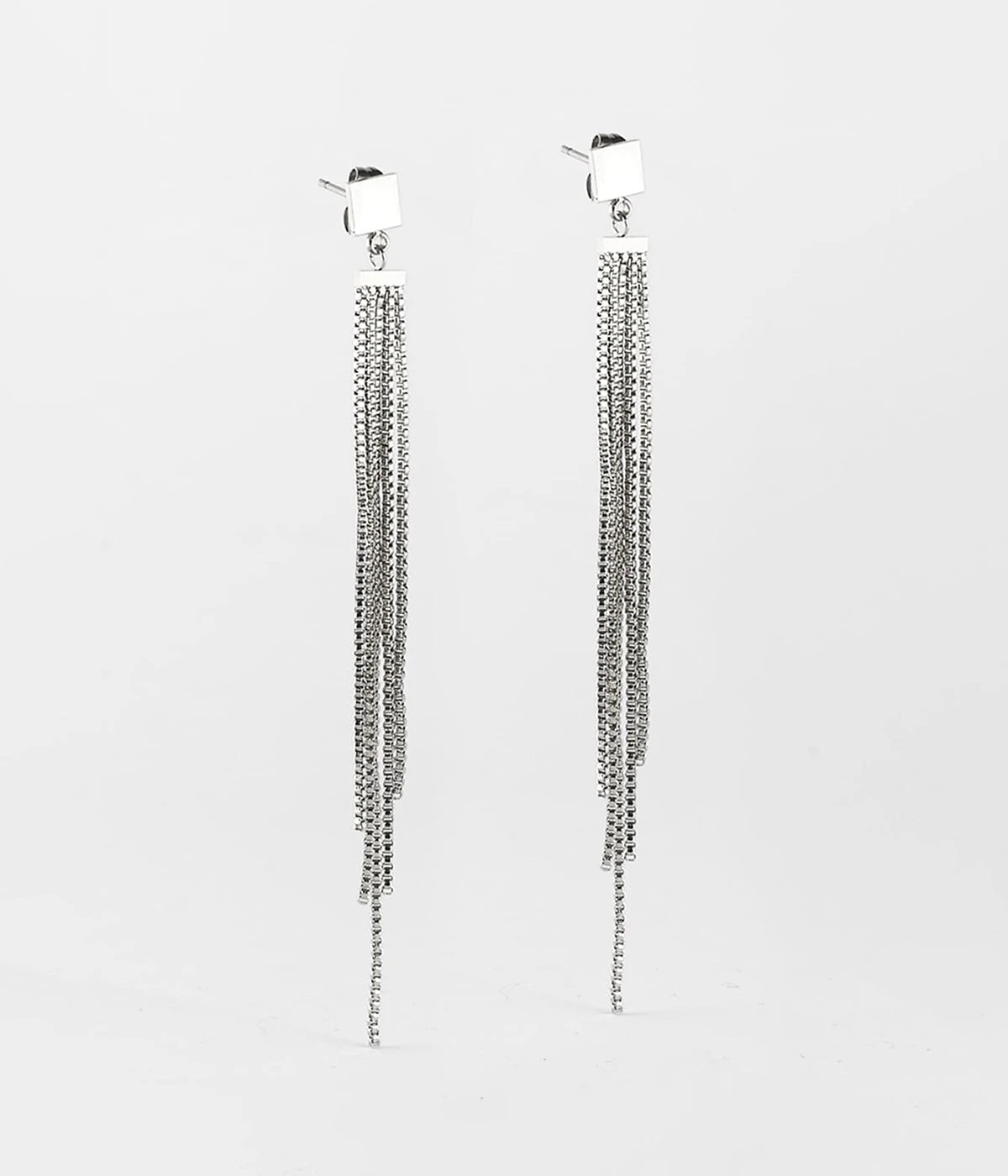 Boucles d’oreilles longues en acier uni ou doré à l’or fin constituées de fines guirlandes de métal.