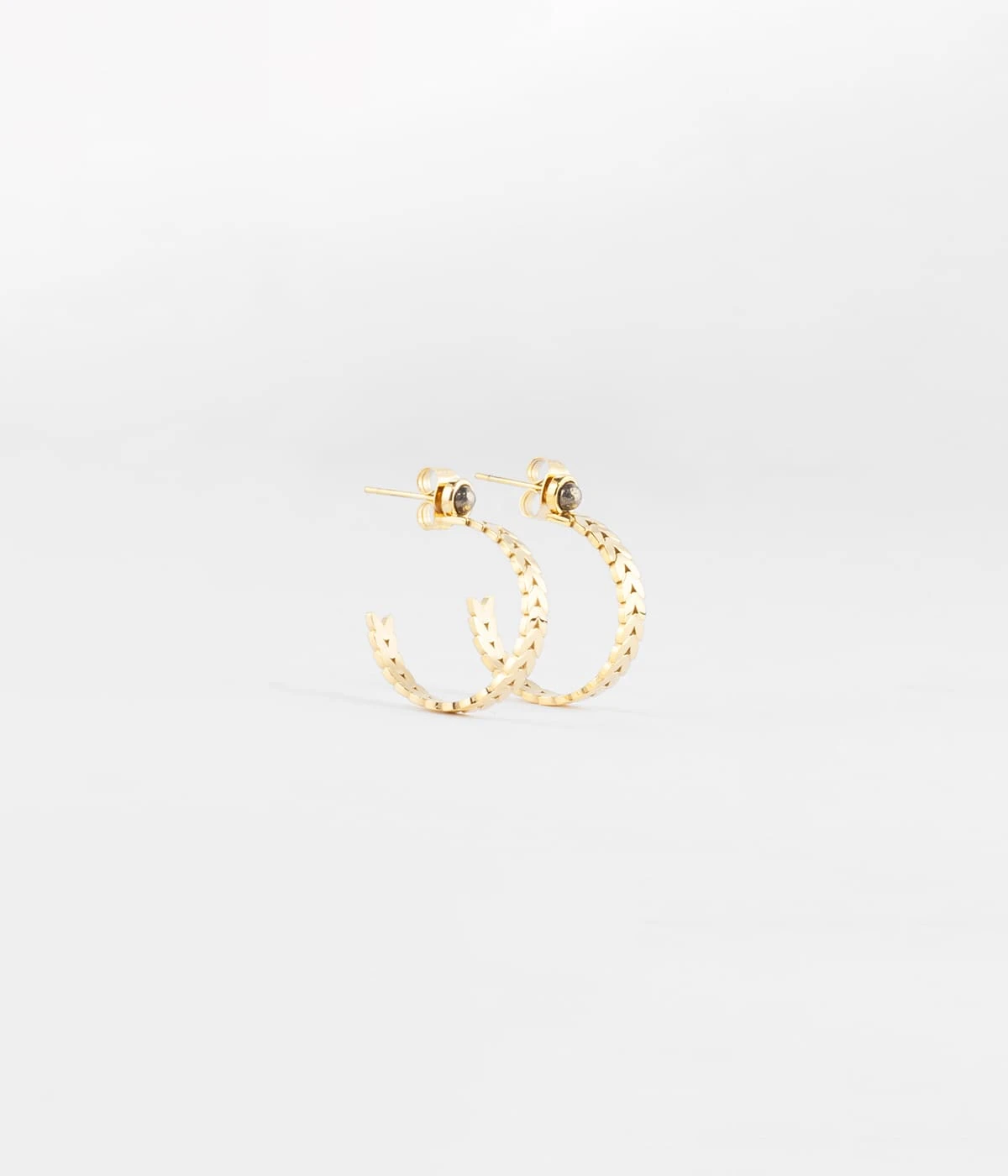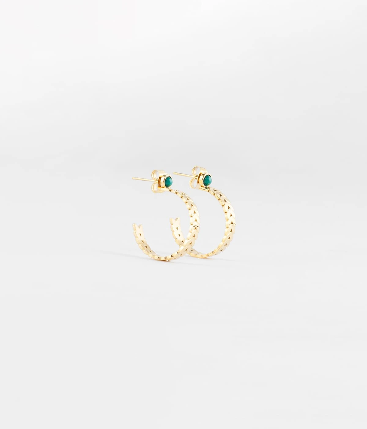 Boucles d’oreilles créoles en acier doré à l’or fin en forme de couronne de laurier montée d’une pierre naturelle.