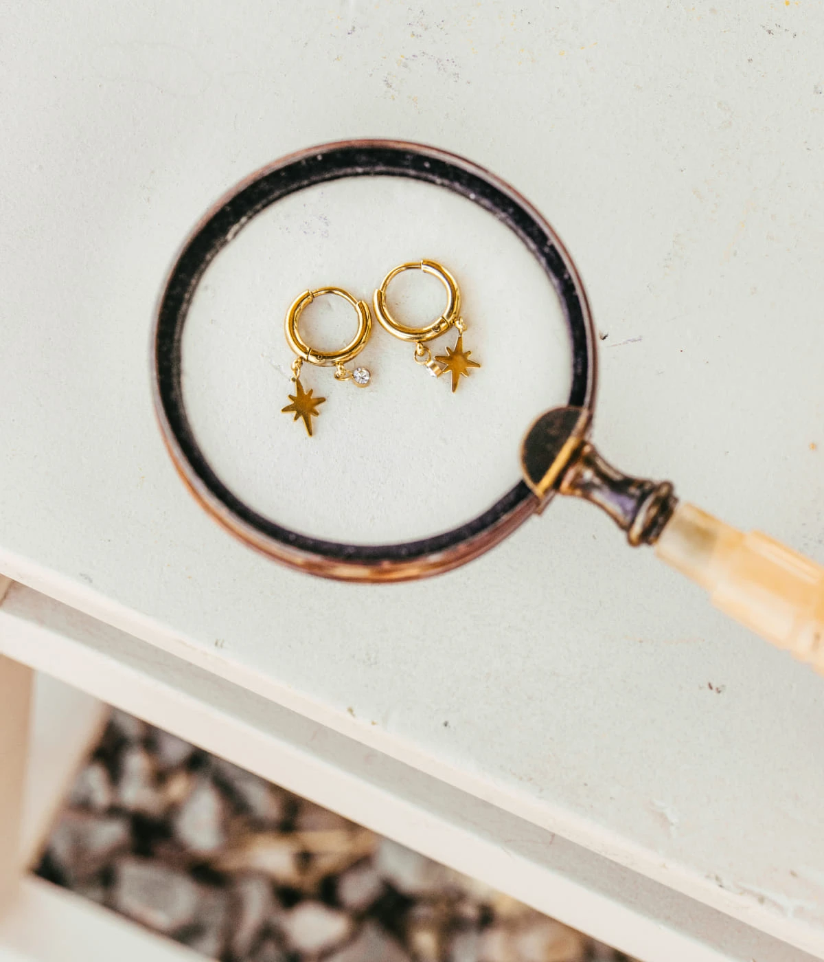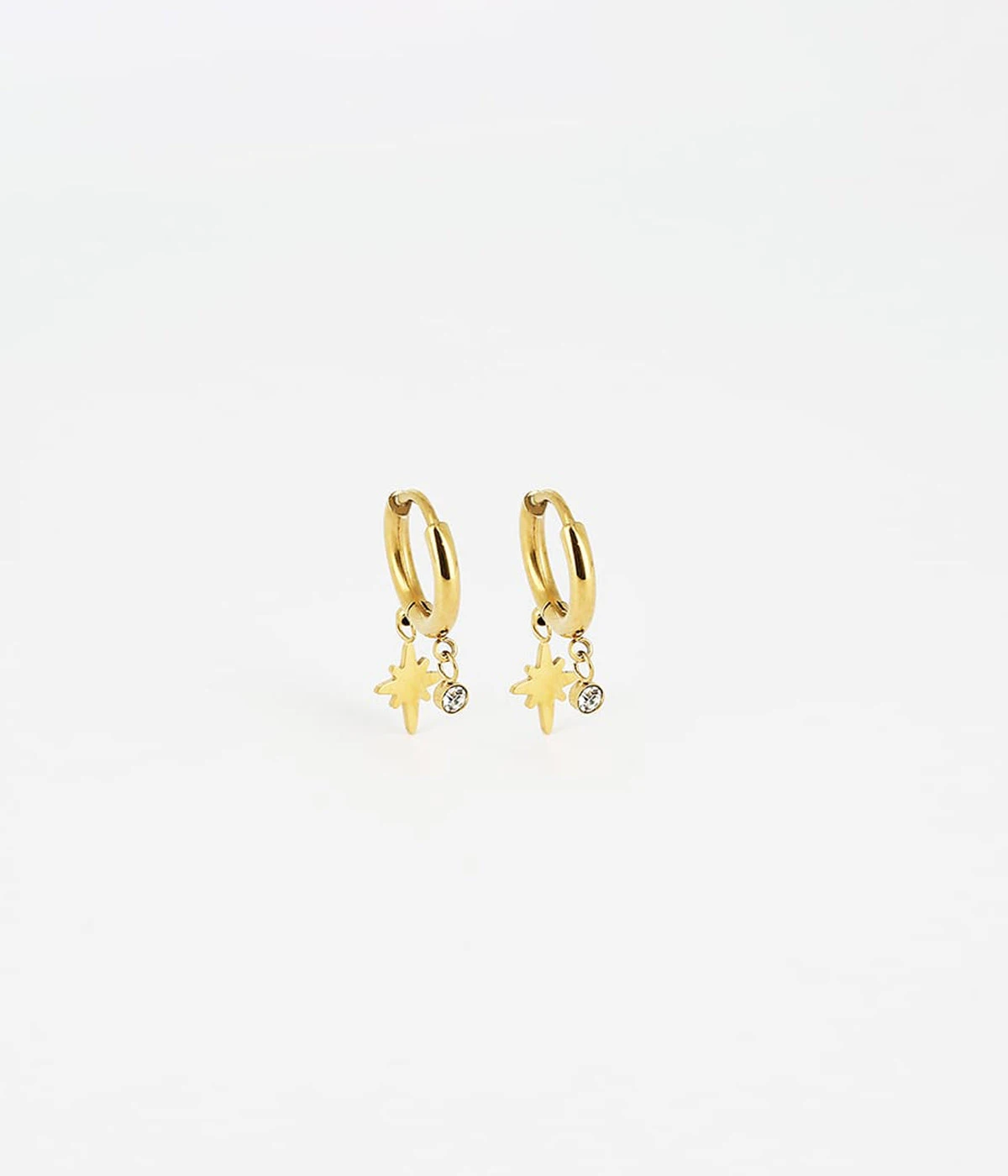 Boucles d’oreilles mini créoles en acier uni ou doré à l’or fin sur lesquelles sont suspendus un motif d’Étoile du Nord et un zirconium en serti clos.
