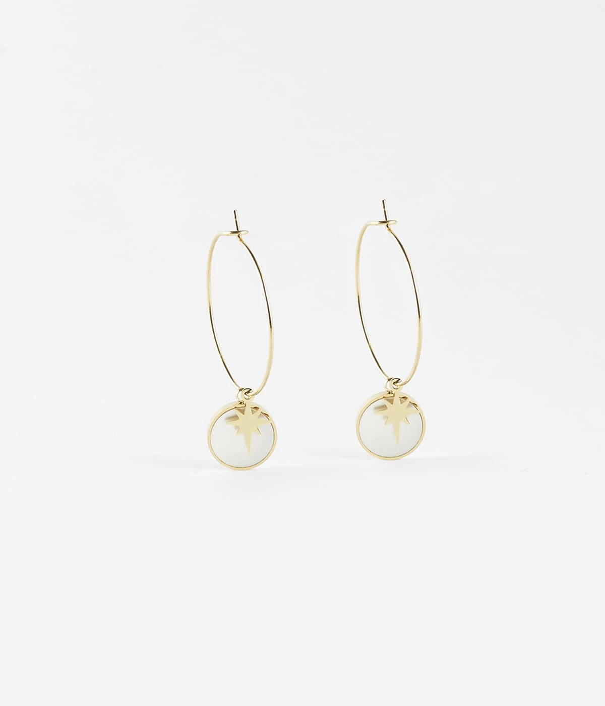 Boucles d’oreilles créoles en acier uni ou doré à l’or fin sur lesquelles sont attachées une médaille de nacre en serti clos et une petite Étoile du Nord.