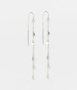 Boucles d’oreilles longues en acier uni ou doré à l’or fin formées de chaînettes sur lesquelles sont accrochées des petites pastilles de métal.