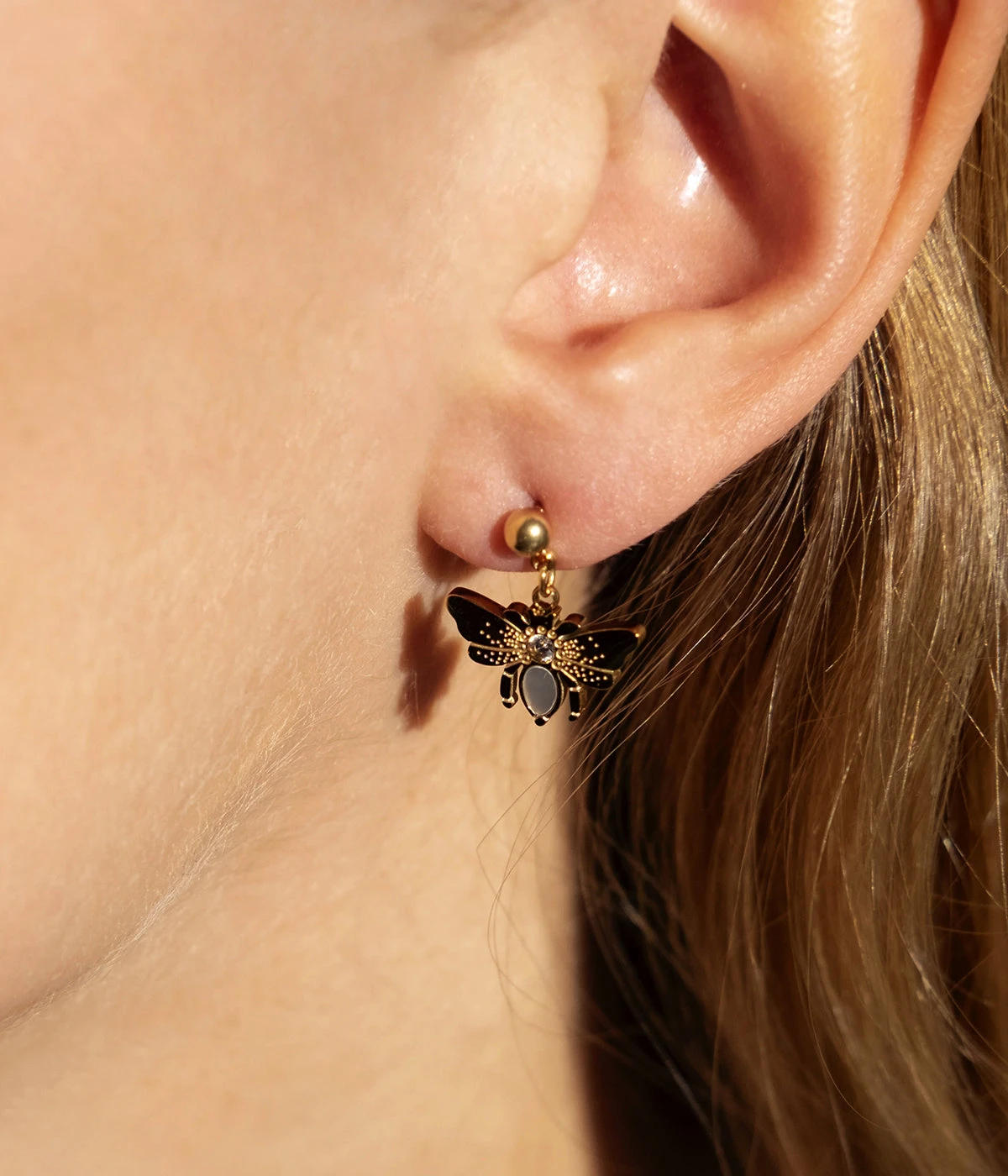 Boucles d’oreilles en acier doré à l’or fin sur lequel est attaché un motif de papillon ciselé et orné de nacre et d’un zirconium.